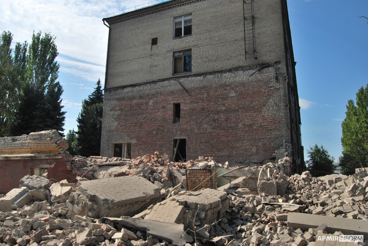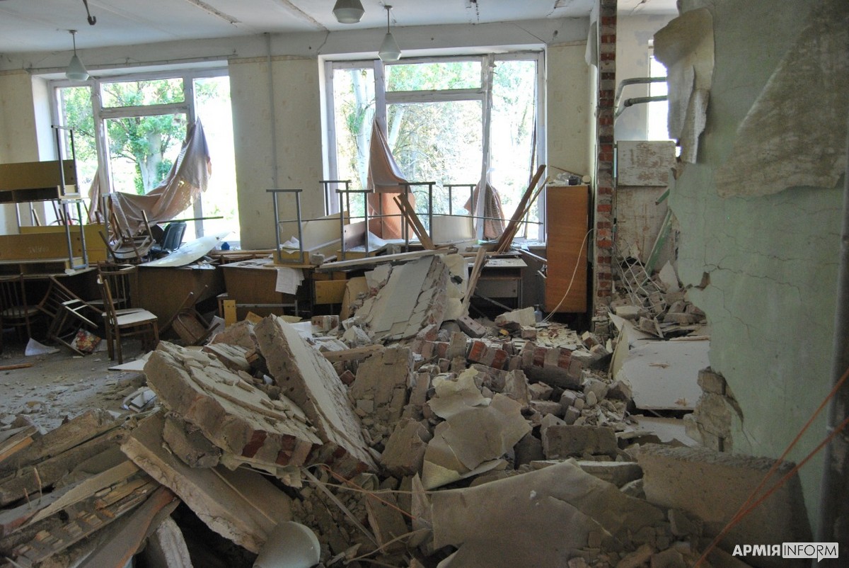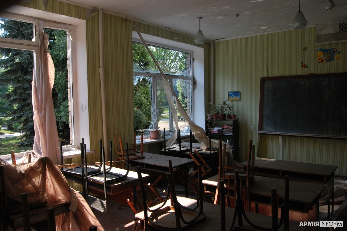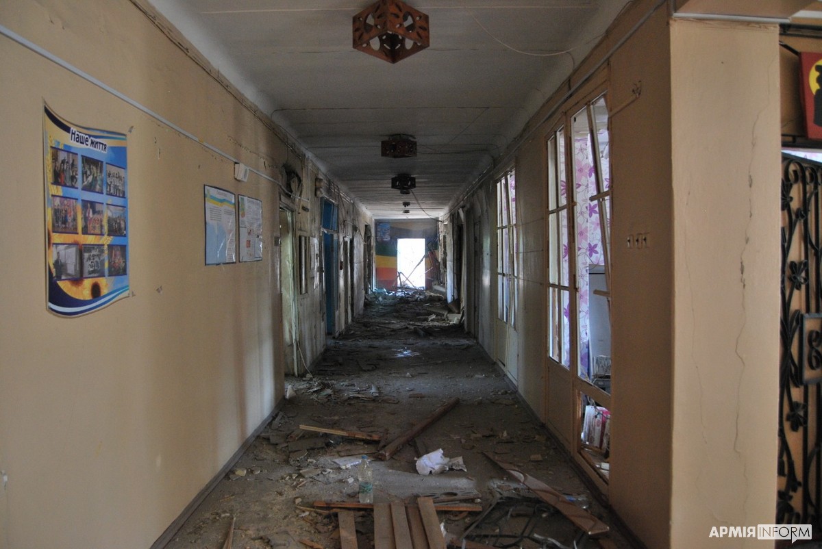 — Військових тут немає, — говорить Віктор Станіславович. — Влучили в спортзал сусіднього корпусу, пішла ударна хвиля, в нас вилетіли вікна, скло. Залишилися тільки три нових вікна на другому поверсі. Спортзал був новенький. Ремонт зробили, дах перекрили. Хороший був спортзал.
