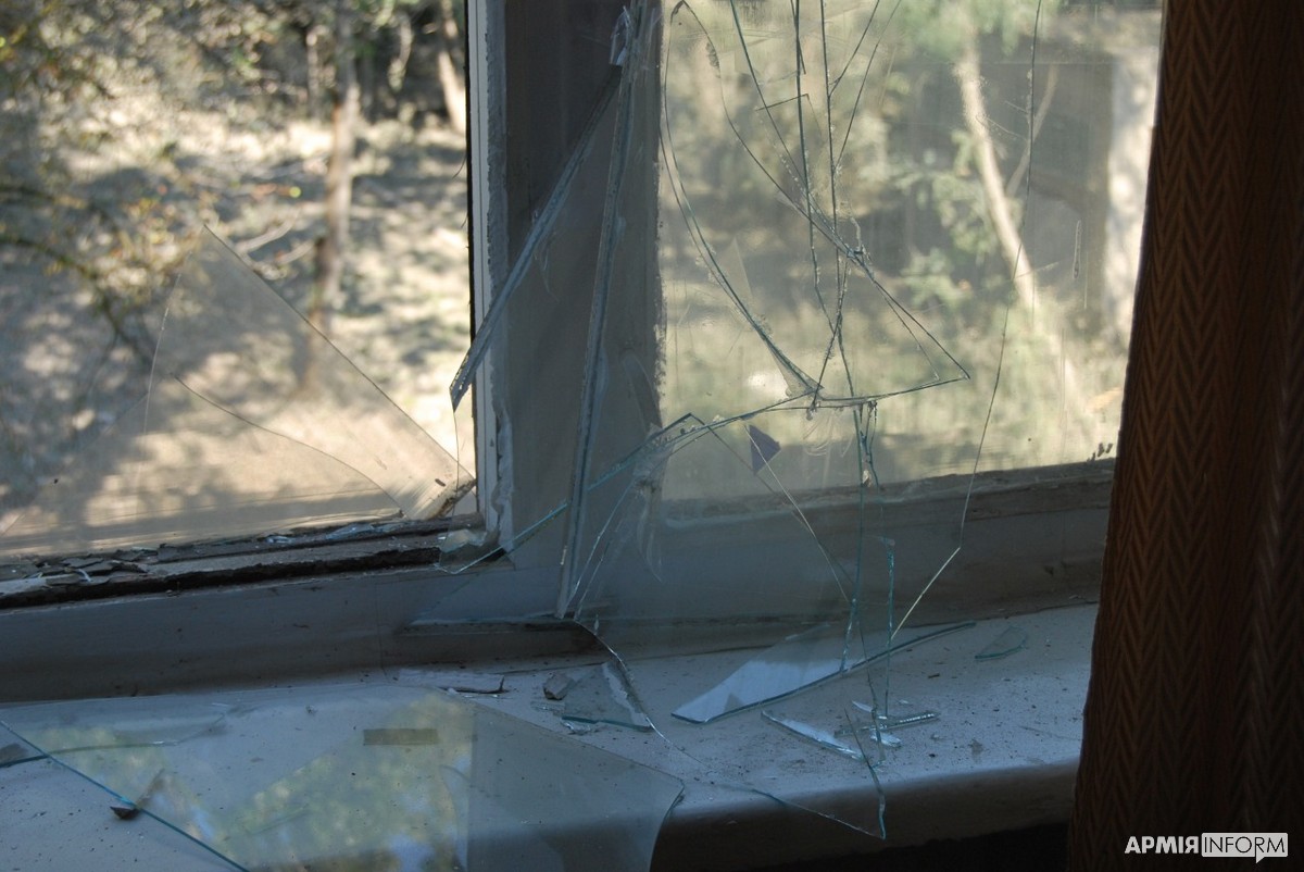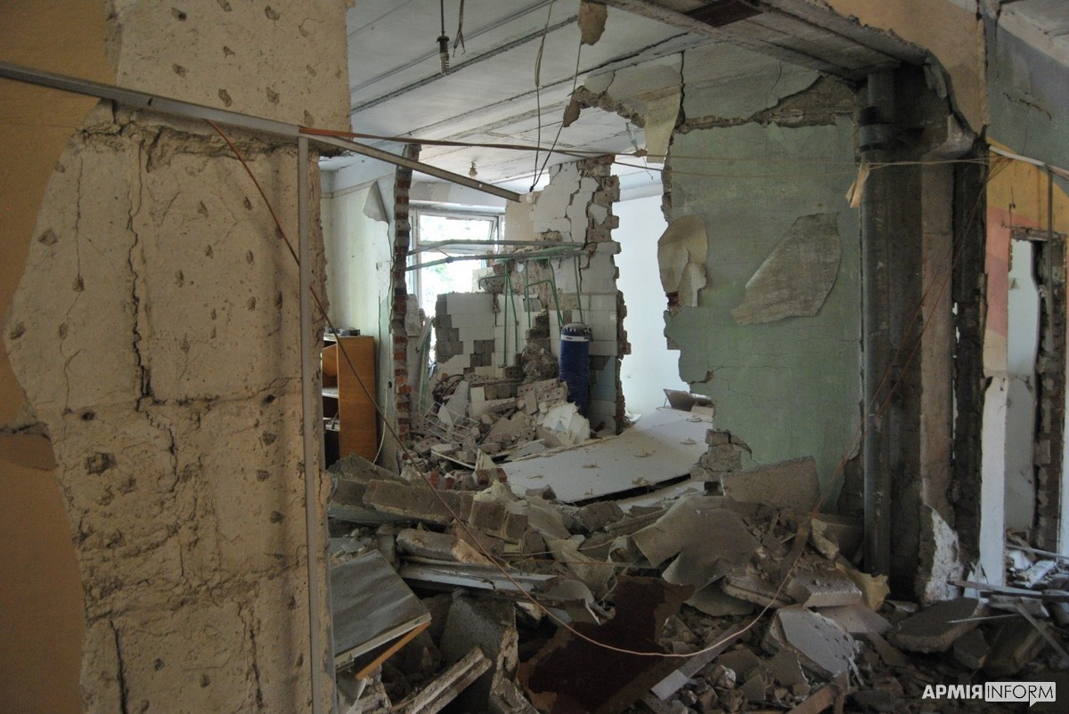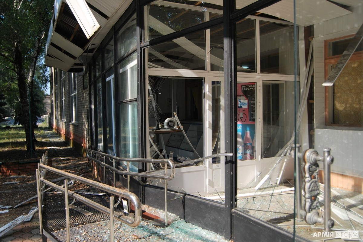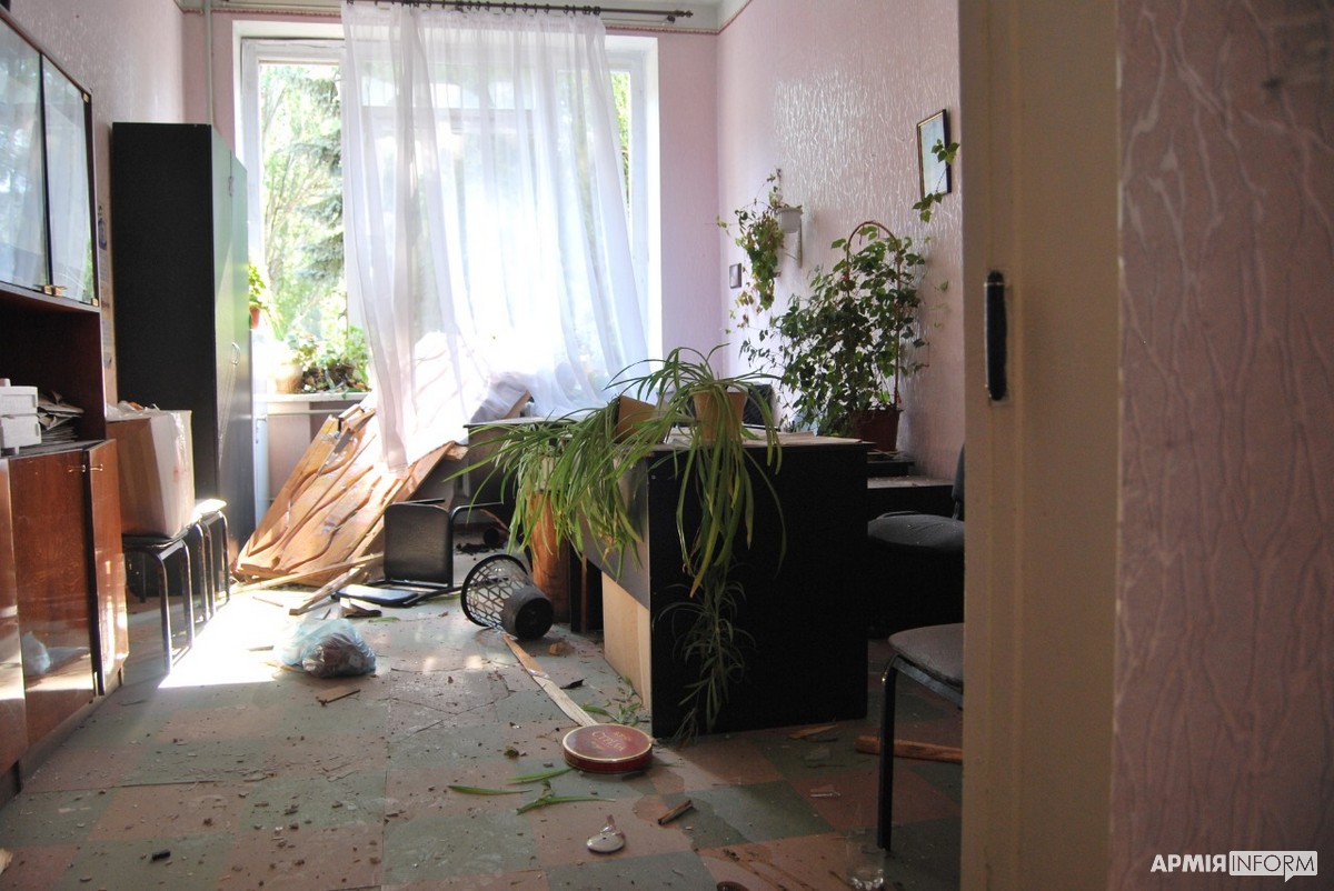 — Усі вікна вибиті, — розповідає він. — У нас тут два корпуси — їх обидва накрило, весь фасад пошкоджений! Та й всередині сильні пошкодження. Перший корпус, повністю площа «накрита», другий корпус теж — весь фасад «вилетів». Слава Богу, люди не постраждали.