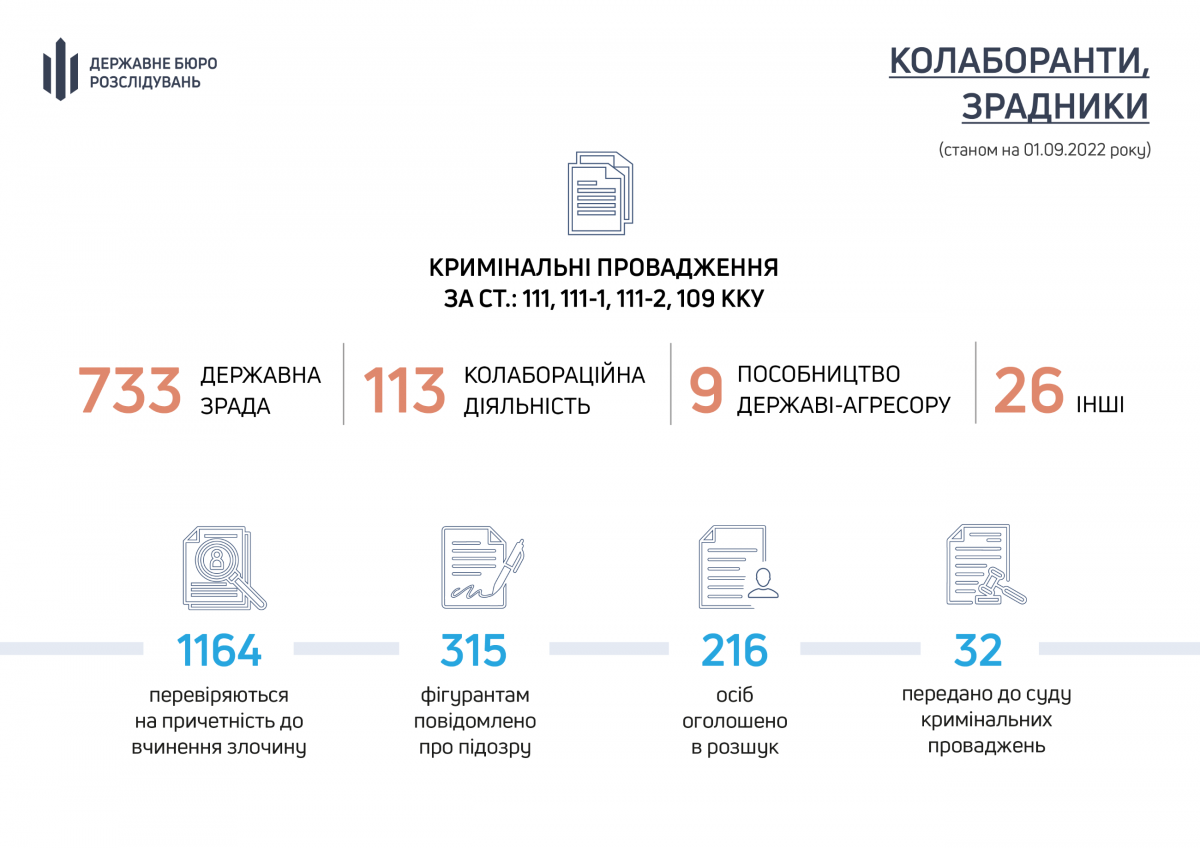 З 24 лютого 2022 року ДБР розслідує 881 злочин проти основ національної безпеки, а саме: 733 кримінальні провадження за державну зраду (ст. 111 ККУ), за колабораційну діяльність – 113 проваджень (ст. 111-1 ККУ), 9 – щодо пособників державі-агресору (ст. 111-2 ККУ) та інші.