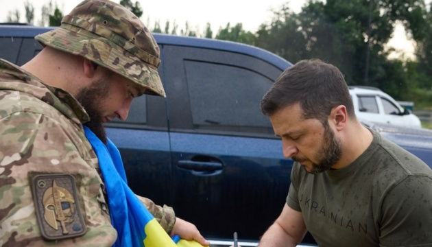 Президент України Володимир Зеленський у ході робочої поїздки в Донецьку область поспілкувався із бійцями 92-го окремого батальйону територіальної оборони, який захищав позиції біля міста Бахмут.