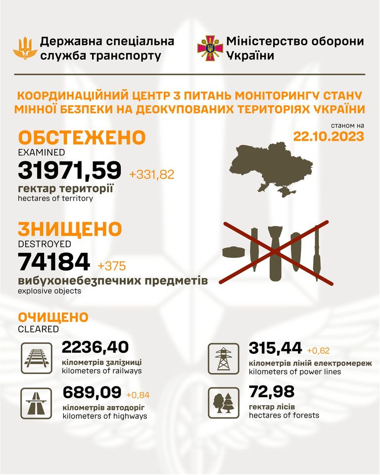 «Саперні підрозділи Державної спеціальної служби транспорту обстежили близько 32 гектарів території та знищили понад 74 тисячі вибухонебезпечних предметів», — йдеться в повідомленні.
