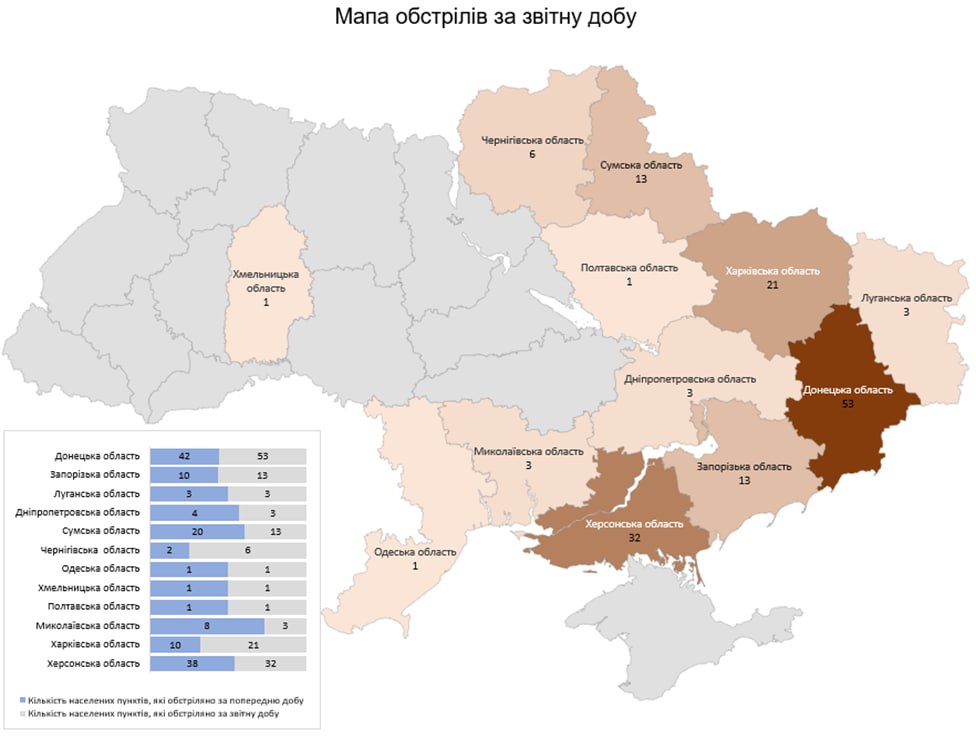 Загалом з різних видів озброєння — міномети, танки, ствольна артилерія, РСЗВ, ЗРК, ОТРК, БПЛА та тактична авіація — були атаковані 150 населених пунктів та 163 об’єкти інфраструктури.