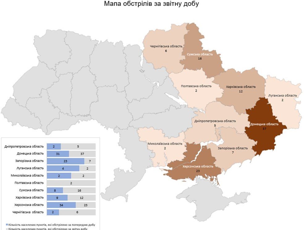 «Загалом з різних видів озброєння — міномети, танки, ствольна артилерія, РСЗВ, ЗРК, ОТРК, БПЛА та тактична авіація — були атаковані 112 населених пунктів та 31 об’єкт інфраструктури», — йдеться в повідомленні.