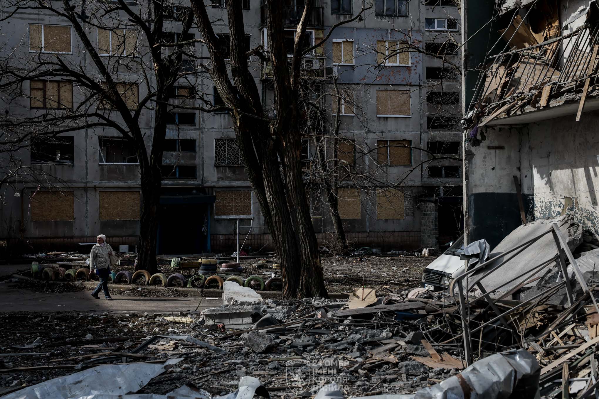 На нових фото можна побачити, як мешканці міста змушені йти двором, понівеченим внаслідок чергового удару керованими авіабомбами. Руйнування стають все масштабнішими, а війна дедалі глибше поглинає місто у своє вогняне пекло.
