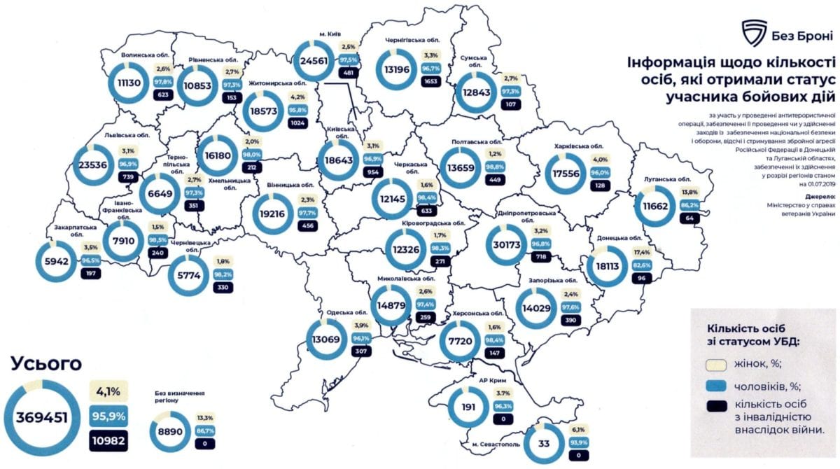 За інформацією Міністерства у справах ветеранів України ,станом на липень 2019 року було зареєстровано 368 861 учасника бойових дій, із них 15 тис. жінок.