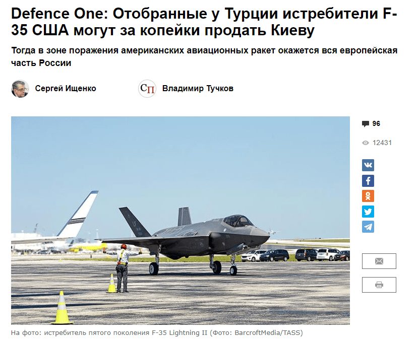 Тож росіяни очікують, що і їх «битимуть» їхньою ж зброєю. Тобто, якщо Україна отримає ці надсучасні винищувачі, то реально вони належатимуть не нам, а американцям. І у випадку загрози саме для США, а не для України, їх і застосовуватимуть: — «У момент різкого загострення військово-політичної ситуації з Росією не українські льотчики, а добре навчені американські інструктори займають місця в кабінах F-35. І чекатимуть не з Києва, а від Пентагону команди на зліт».