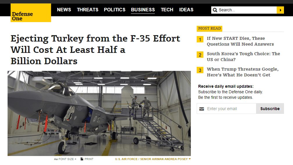 Ця тема, пише видання, виникла після того, як президент Дональд Трамп вирішив покарати Туреччину за покупку в Росії, всупереч протестам Вашингтона, зенітно-ракетної системи С-400. США скасовують багатомільярдну (загальна сума — до 9 млрд доларів) операцію з придбання Туреччиною сотні давно замовлених у корпорації LockheedMartin бойових літаків F-35. Уже нині за океаном є готові, принаймні, чотири новенькі F-35, виготовлені на виконання цього контракту.