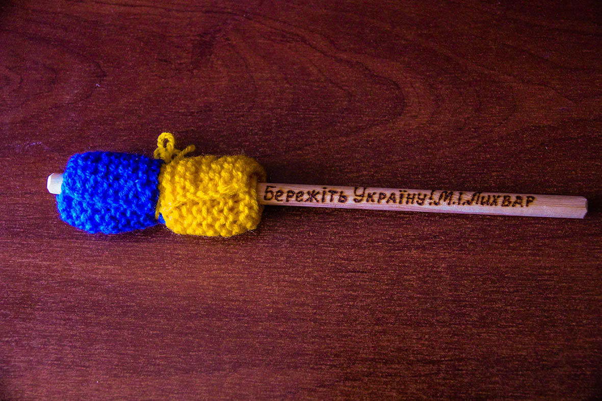 Також на виставці можна побачити унікальний прапор, який власними руками сплела відома волонтерка та патріотка з міста Запоріжжя Марія Лихвар. Ця жінка стала відома під час Революції гідності. Більш ніж поважного віку, вона, спираючись на милиці і не боячись палиць беркутівців, прийшла на Майдан. На свою жалюгідну пенсію ця мужня жінка не змогла придбати прапорець у магазині, тому сплела його власноруч із синіх і жовтих ниток, які мала вдома. Розганяючи мирних мітингувальників, міліціянти нещадно били всіх: жінок, дітей, чоловіків. Але немов зачаровані обходили стороною старшу жіночку, що з милицями стояла посеред цього пекла, тримаючи в руках маленький саморобний прапор України. Коли почалося російське вторгнення в Україну, пані Марія почала плести прапорці і передавати їх на фронт. У колі військовослужбовців це вважалося дуже сильним оберегом.