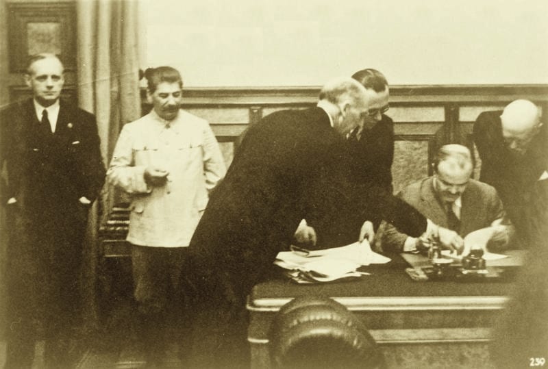 На фото: В’ячеслав Молотов 23 серпня 1939 року підписує нацистсько-радянський пакт про ненапад. Зліва направо: Йоахім фон Ріббентроп, Йосип Сталін, Фрідріх Вільгельм Гаус, Густав Хільгер, Фрідріх фон дер Шуленбург © ImperialWarMuseums / Wikipedia