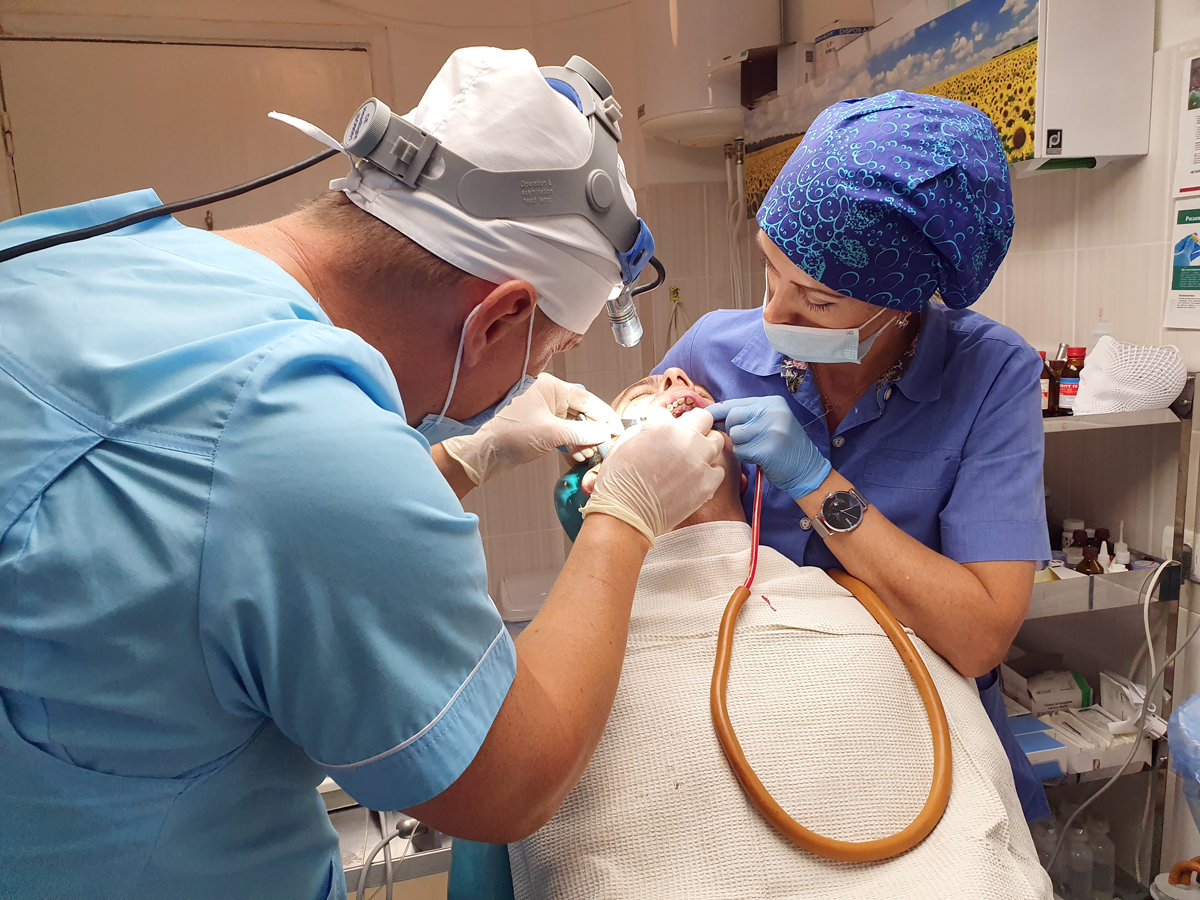 – Для мене як для лікаря є обов’язком допомогти таким людям, які пройшли пекло війни, повернути їм нормальне соціальне життя, – додає Віктор Мазур. – У той час на базі нашої клініки вже працювали цивільні одеські лікарі-волонтери, які приїжджали зі своїми лікарсько-сестринськими бригадами, так би мовити, підставили нам плече, адже більшість наших військових спеціалістів працювали в районі проведення бойових дій. Тоді я звернувся до наших колег в Одесі, розповівши про те, що є люди, яким необхідно не просто зробити протез і забути про них, а реабілітувати на сто відсотків. Першим відгукнувся відомий одеський спеціаліст – доцент кафедри хірургічної стоматології Одеського національного медичного університету Валерій Лунгу, і вже вберезні 2015 року ми вперше провели таку акцію. Після цього до нашого руху приєдналося багато інших лікарів. Наприклад, Валерій Обухівський із клініки «Овасак», до речі, його син також стоматолог, і він добровольцем пішов у складі 61-го мобільного госпіталю в район АТО. Клініка «Гранд-дент», лікар Ареф АльМухамед, він сам сирієць, його родина постраждала в конфлікті, до якого також доклала руки Росія, тому для нього ця допомога є питанням особистим. Дуже допомагає волонтерський рух «Тризуб Дендал», президент Асоціації імплантологів України Мирон Угрин, з яким ми тісно співпрацюємо.