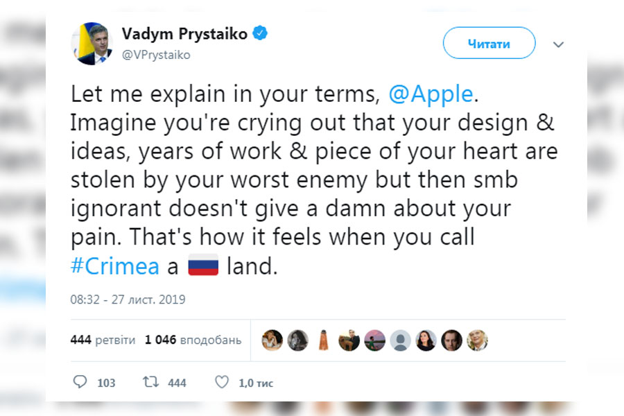 Міністр закордонних справ України Вадим Пристайко розкритикував американську компанію Apple за позначення на її мобільних картах Криму як частини Росії. Про його допис у твіттері з цього приводу повідомляє «Європейська правда».