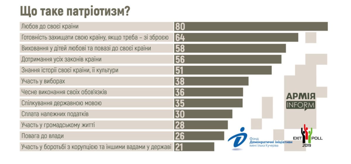 Основними складовими патріотизму більшість українці вважають передовсім любов до своєї країни та готовність захищати її, якщо треба – зі зброєю. Про це свідчать результати дослідження, проведеного Фондом «Демократичні ініціативи» імені Ілька Кучеріва спільно з соціологічною службою Центру Разумкова, які оприлюднені на сайті фонду «Демократичні ініціативи» імені Ілька Кучеріва.