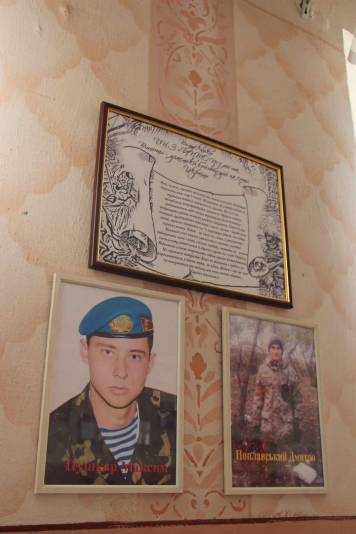 Експозицію відкрили просто в одному з коридорів навчального корпусу. Звісно, тубуси від реактивних гранатометів і ПТКР, корпуси й макети мін, гільзи й уламки смертоносної зброї різних калібрів, шоломи й предмети спорядження, прапори з пам’ятними написами потім приберуть до спеціальної кімнати, своєрідного музею закладу. А майже три десятки портретів воїнів залишатимуться на стінах як приклад мужності та вірності військовому обов’язку для нинішнього та прийдешнього поколінь.