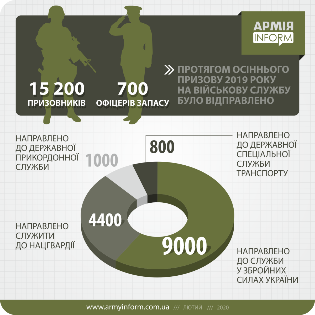 У Міністерстві оборони України повідомили, що протягом осіннього призову 2019 року на військову службу було відправлено 15 200 призовників та ще 700 офіцерів запасу. Про це йдеться у відповіді Міноборони на запит ТСН.ua.