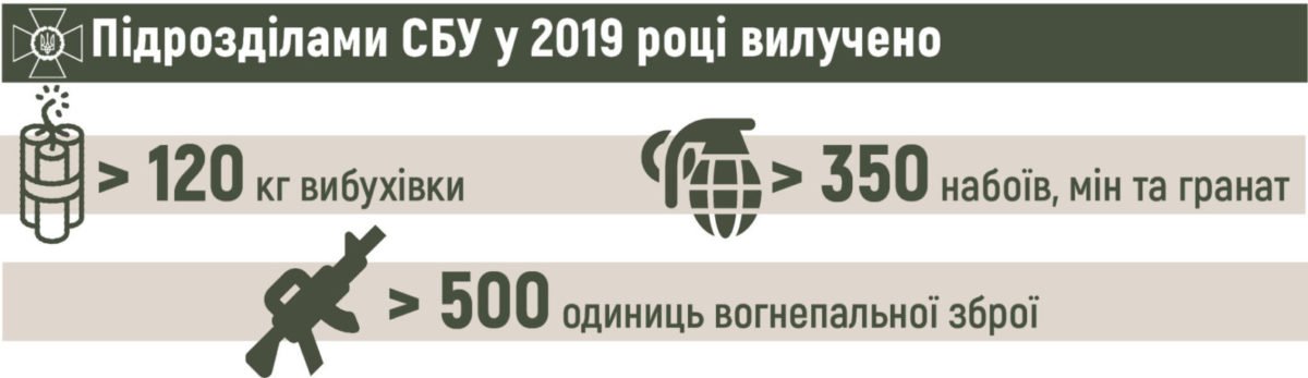 Підрозділи СБУ у 2019 році вилучили 500 одиниць вогнепальної зброї, 120 кг вибухівки та 350 набоїв, мін і гранат. Про це йдеться у повідомленні Служби безпеки України у Facebook.