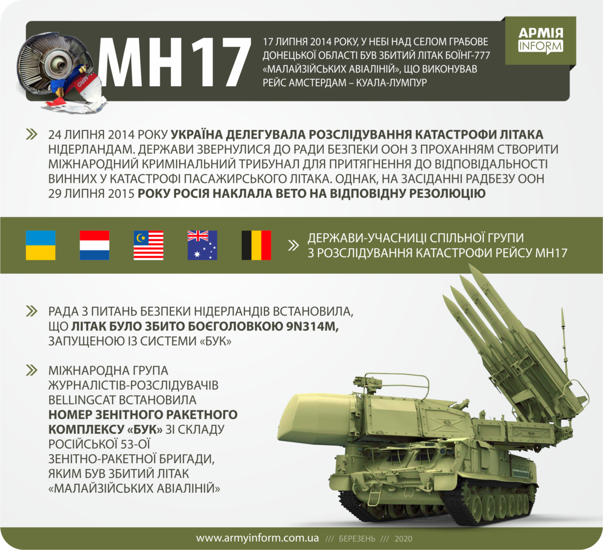 17 липня 2014 року у небі над Донбасом з ракети «Бук» збили пасажирський Boeing 777. Він належав авіакомпанії Malaysia Airlines та виконував рейс Амстердам – Куала-Лумпур. На борту перебували 298 пасажирів і членів екіпажу, усі загинули. Офіційне слідство підтвердило: комплекс «Бук», ракета якого влучила в літак, привезли на тимчасово окупований Донбас. Належала вона 53-й ППО ЗС Росії. Влада РФ заперечує причетність своїх структур до трагедії.