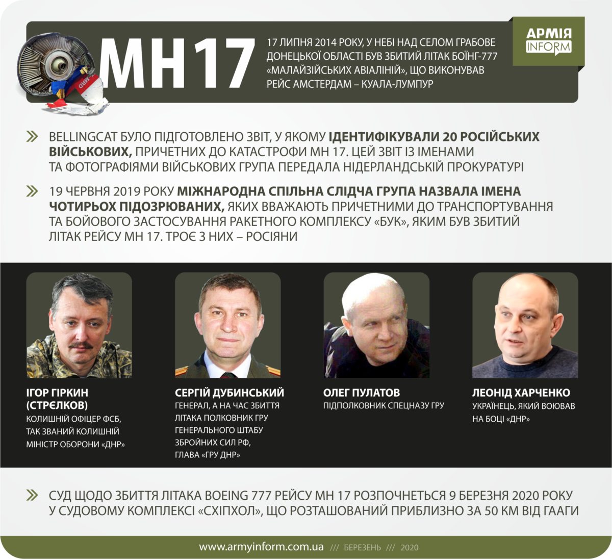 Судовий процес у цій справі розпочався в понеділок, 9 березня, в Окружному суді Гааги в юридичному комплексі, розташованому неподалік аеропорту «Схіпхол». А в декількох сотнях метрів гул літаків на злітно-посадковій смузі нагадував про те, що саме звідси 17 липня 2014-го розпочався рейс «Малайзійських авіаліній», який підступно збили над східною частиною України, що контролюють окупаційні сили РФ. Всі 298 осіб на борту, дві третини яких – громадяни Нідерландів, – загинули.