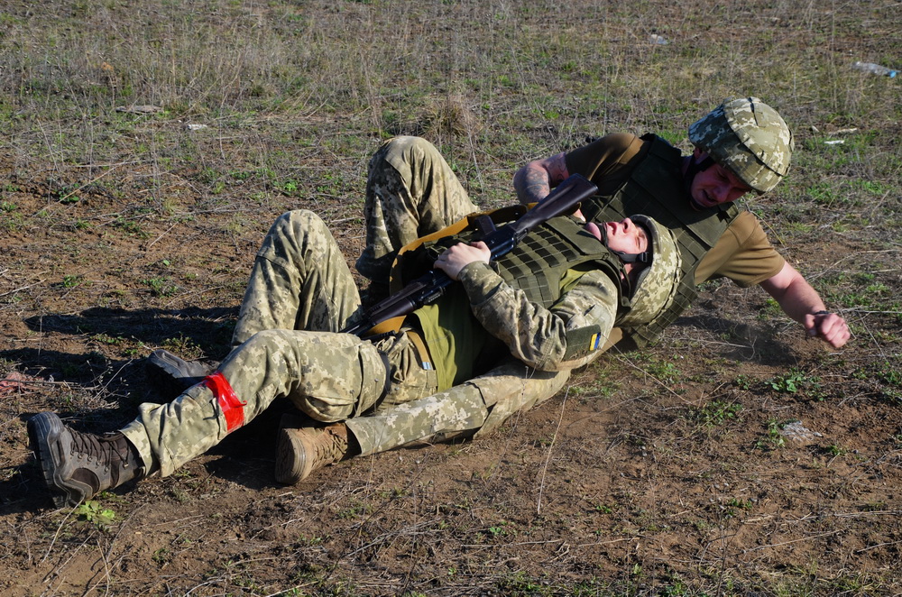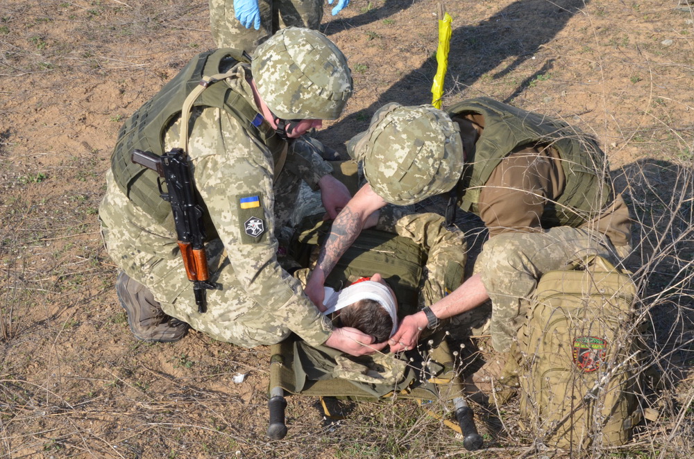За умовами навчання, під час бою серед наших бійців з’явилися троє «трьохсотих» із різними пораненнями. Зрозуміло, що на першому етапі під обстрілом поранений сам, якщо при свідомості, має вміти накласти джгути, вколоти потрібний препарат. Але так буває не завжди й поранений є непритомним, тож товариші чи санінструктор повинні надавати першу допомогу: зупиняти кровотечу, накладати джгут. Потім санінструктор чи бойовий медик відтягує його до пункту сортування поранених, де надають першу допомогу: зупиняють кровотечу, перевіряють джгути, оглядають на предмет прихованих кровотеч чи поранень та травм, контузій тощо.