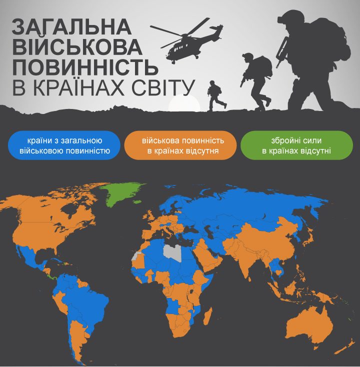 У світі є країни, в яких узагалі немає строкової служби, є держави, де призов не проводять у мирний час, а також країни, де періодично відбувається призов до армії.