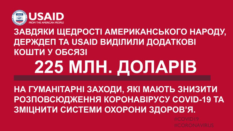 «Державний департамент США та USAID оголосили про виділення додаткових коштів у обсязі 225 млн дол. для здійснення гуманітарних заходів, що мають знизити розповсюдження коронавірусу COVID-19 та зміцнити системи охорони здоров’я», – зазначено в повідомленні.