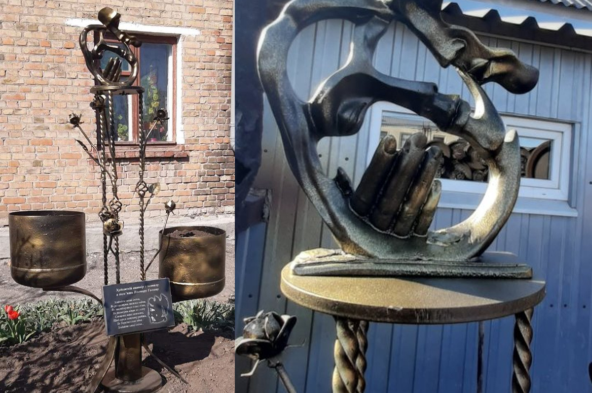 – До нас звернулася мама Віктора Олена. Вона переймалася тим, що жива огорожа навколо клумби під меморіальною дошкою з часом зіпсується, тому і попросила нас зробити нову ковану огорожу, – говорить один із братів-ковалів Юрій Гребенюк. – Так ми створили художню композицію: вгорі бюст, що символізує обійми чоловіка, який іде на війну, а внизу – металеві вазони та ковані троянди.