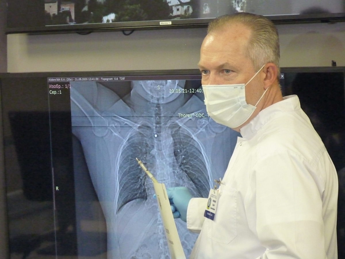 – 33-річний офіцер Сергій дивом залишився живим, – розповів Сергій Анатолійович. – Він зазнав уламкових поранень шиї, грудної клітки, гомілки. А один з уламків, більший за пів сантиметра, пробив бійцеві грудну клітку та, по суті, ліг на серцеву сумку й зупинився в міліметрах від серцевих судин. Лікарям довелося робити складну операцію, щоб дістати цей уламок, що будь-якої миті міг обірвати життя молодого воїна. Все вдалося, й загроза життю вже позаду. Нині Сергій видужує. Інший пацієнт – 42-річний боєць Володимир – зазнав численних уламкових поранень лівої частини грудної клітки, плеча, колінного суглоба, мінно-вибухової та черепно-мозкової травм. Нині він у стані середньої тяжкості. Усі уламки, від яких постраждали воїни, могли обірвати їхні життя будь-якої секунди. Це те, що нам удалося вивести на комп’ютерну томографію. І уламок у шиї, і уламок тут у середостінні… Ви знаєте, вони повністю ними «нафаршировані». І дуже здорово, що хлопці потрапили в надійні руки.
