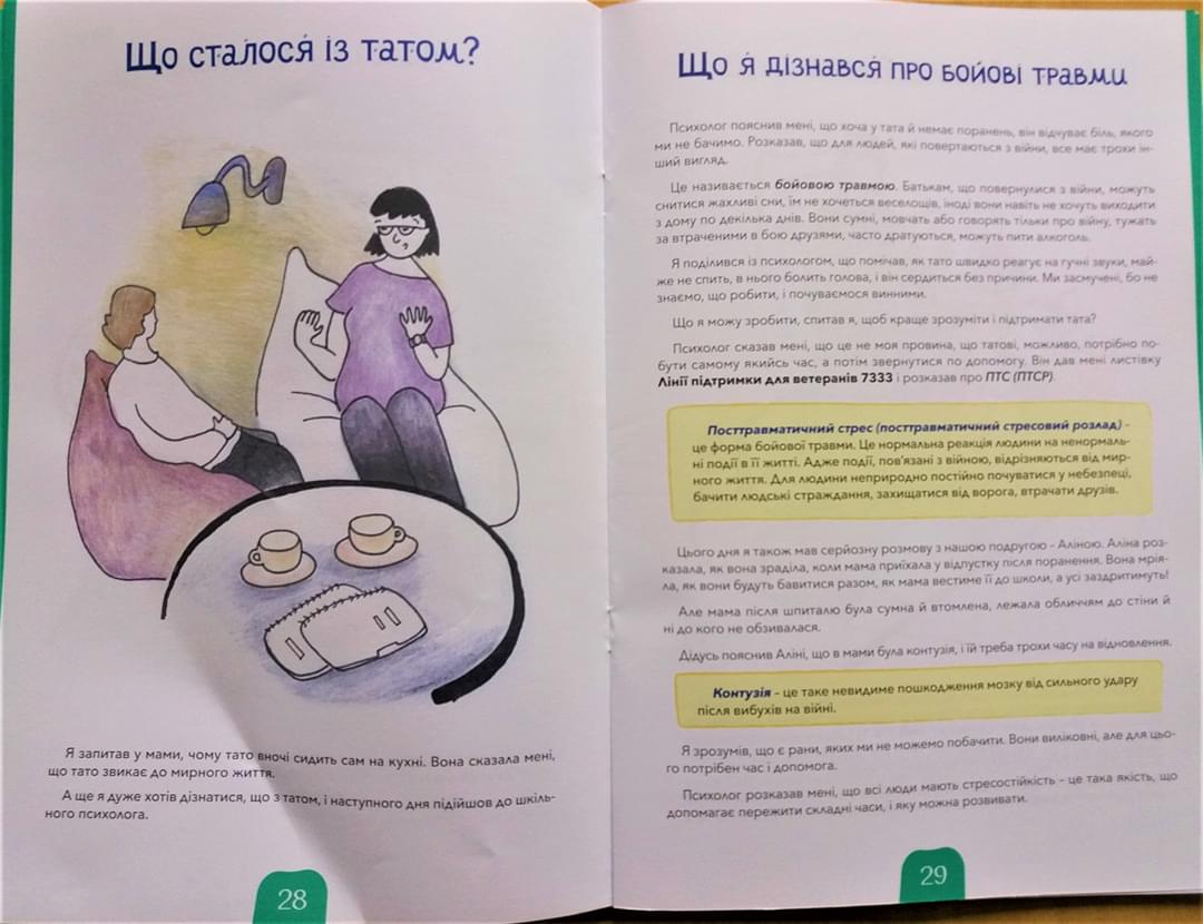 – Ця книжка розроблена колективом сімейних та дитячих психологів для членів сімей наших бійців. Особливо корисною вона буде для дітей. Адже часто вони не розуміють, де тривалий час знаходився їхній батько або мати, чому тато сумний, а інколи і агресивний, чого пішов у одному емоційному стані, а повернувся в іншому, – розповів директор соціально-психологічного центру міста Славутич, куди надійшла книга, Віктор Одиниця.