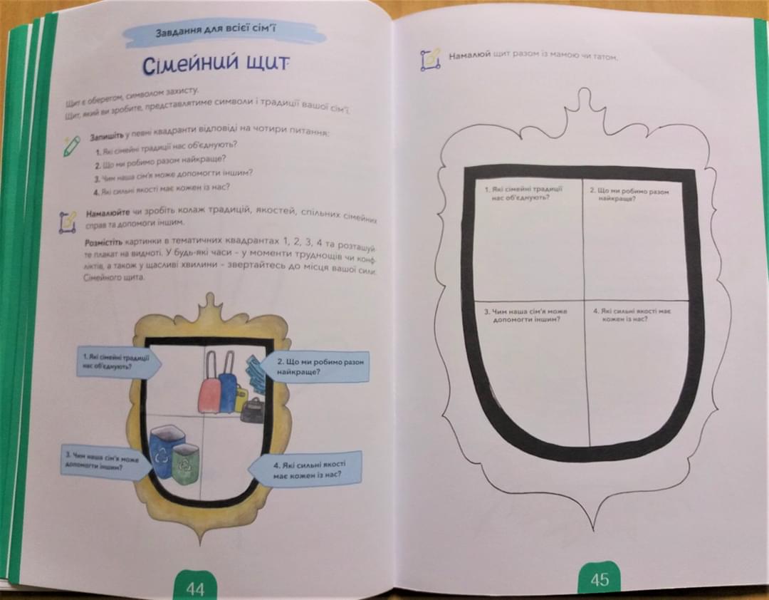 – Із точки зору психології є три кола реінтеграції в цивільне життя, зокрема суспільство, громада та родина. І ця третя складова є найголовнішою. Тобто як буде працювати родина, аби перебудувати на мирний лад воїна-тата, що повернувся з району бойових дій. Якщо дорослі члени сім’ї переважно обізнані про це, то дитина має обмаль інформації. І ця книжка передбачена насамперед, щоб це в адаптивній формі пояснити дитині, – продовжив Віктор Одиниця. – Наприклад, є такий собі «щит родини». Треба написати, що об’єднує ту чи іншу сім’ю, які цінності найважливіші для неї тощо.