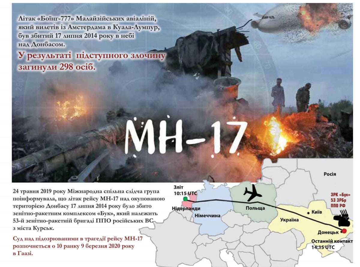 Пасажирський Boeing-777 “Малайзійських авіаліній”, що виконував рейс МН17 із Амстердама до Куала-Лумпура, був збитий над окупованим Донбасом 17 липня 2014 року. На борту лайнера перебували 283 пасажири та 15 членів екіпажу, всі вони загинули.