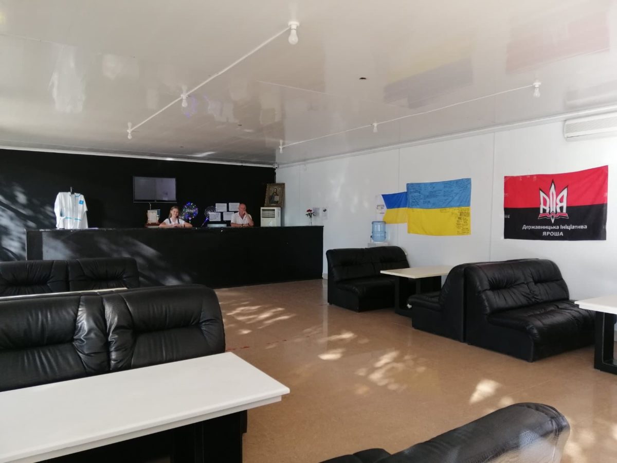 Але найбільш атмосферним є ресепшн готелю — розписані прапори, подяки, грамоти, фотографії бійців, шеврони, сувеніри…