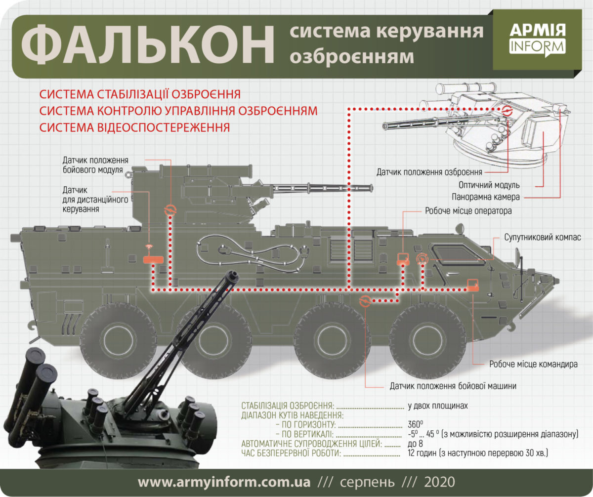 В Україні створили універсальну систему управління озброєнням «Фалькон». Її можна інтегрувати на легкоброньовані платформи, як-от БТР чи БМП, а також встановлювати в модулі, змонтовані на плавучих засобах і стаціонарних об’єктах. Наявні оптико-електронні прилади дають змогу як удень, так і вночі спостерігати за навколишньою місцевістю та окремими об’єктами (цілями) у простих і складних метеорологічних умовах.