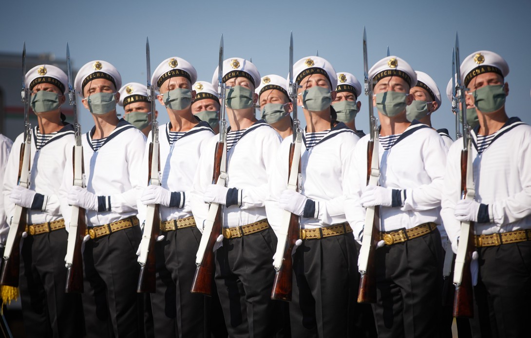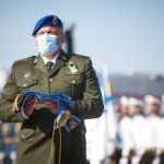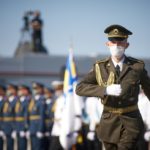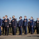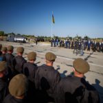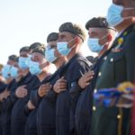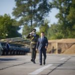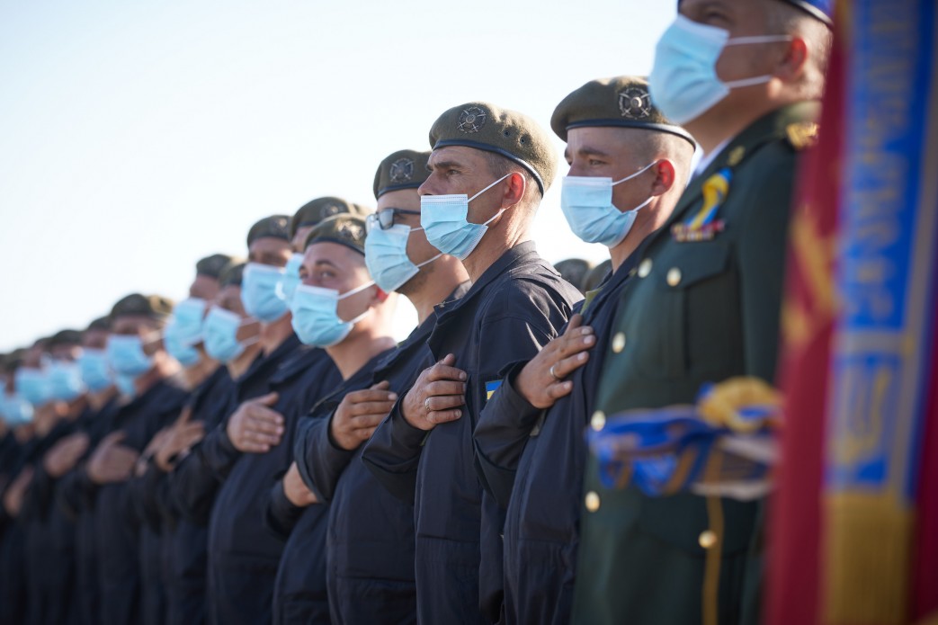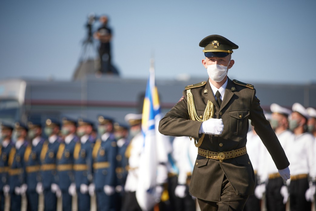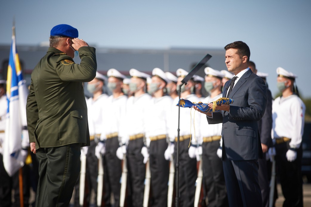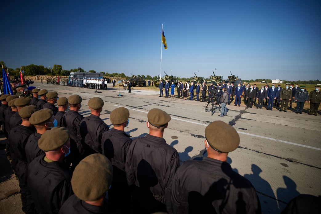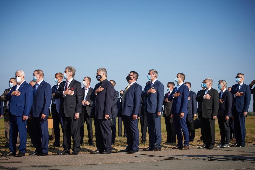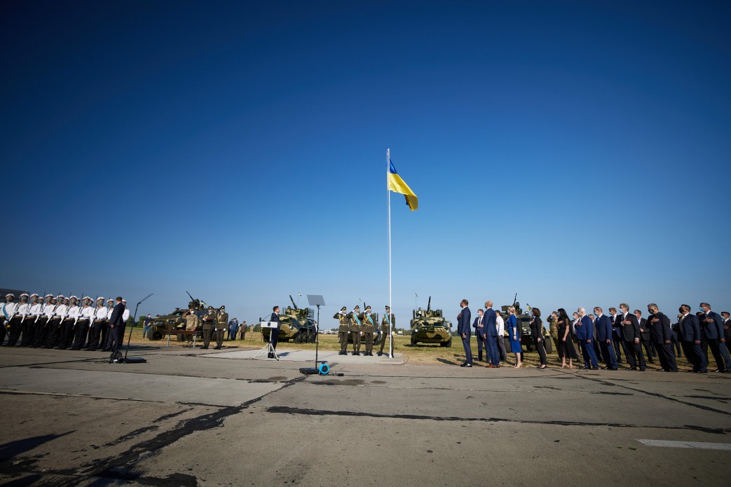 Під звуки Державного гімну воїни роти почесної варти Збройних сил України підняли полотнище національного стяга над аеродромом. Військові відсалютували десятьма залпами.