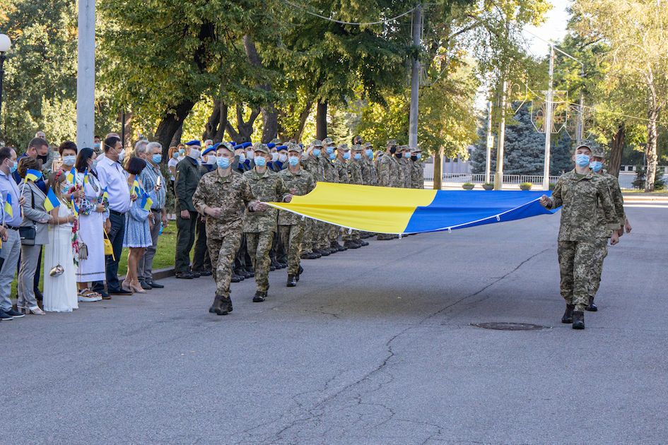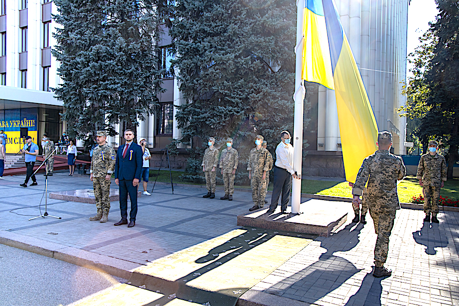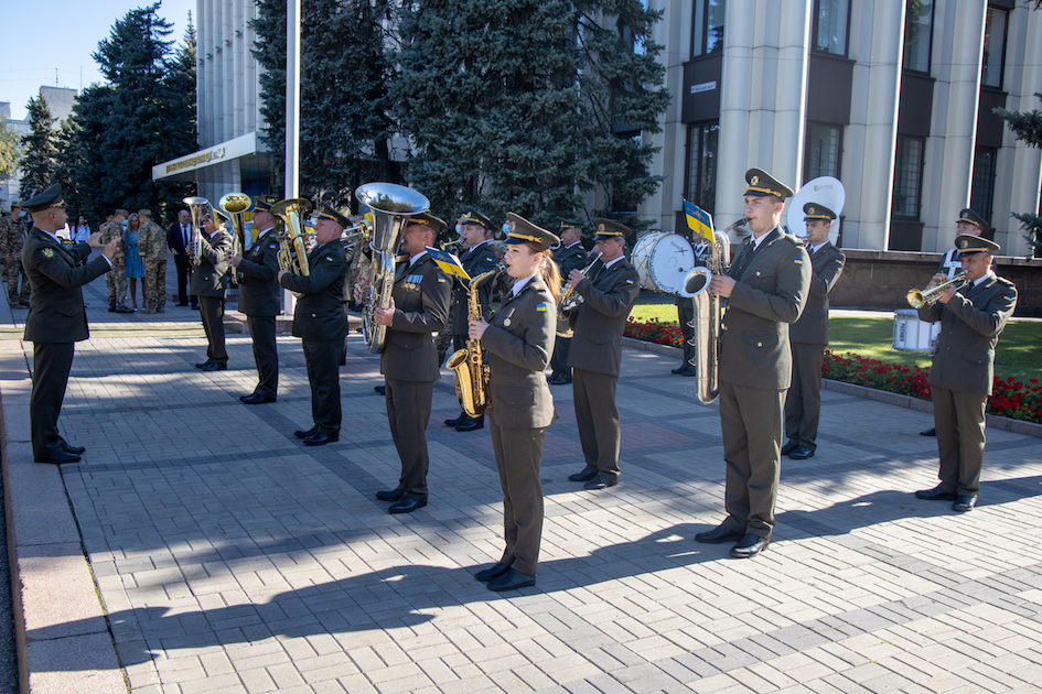 Під музичний супровід військового оркестру оперативного командування «Схід» військовослужбовці винесли Державний Прапор України. Присутні віддали данину пошани одному із символів державності України. Під звуки Державного Гімну національний синьо-жовтий стяг підняли на флагшток.