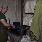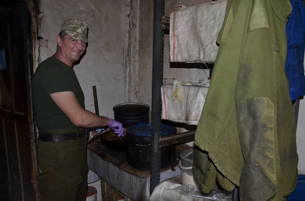 На кухні нас зустрів кухар старший солдат Олег. На честь свята він вирішив приготувати побратимам гороховий суп із м’ясом і овочеве рагу. Те, що це справді смачно, ніхто не сумнівається, адже цивільний фах Олега – шеф-кухар, і раніше він працював у справжньому ресторані.