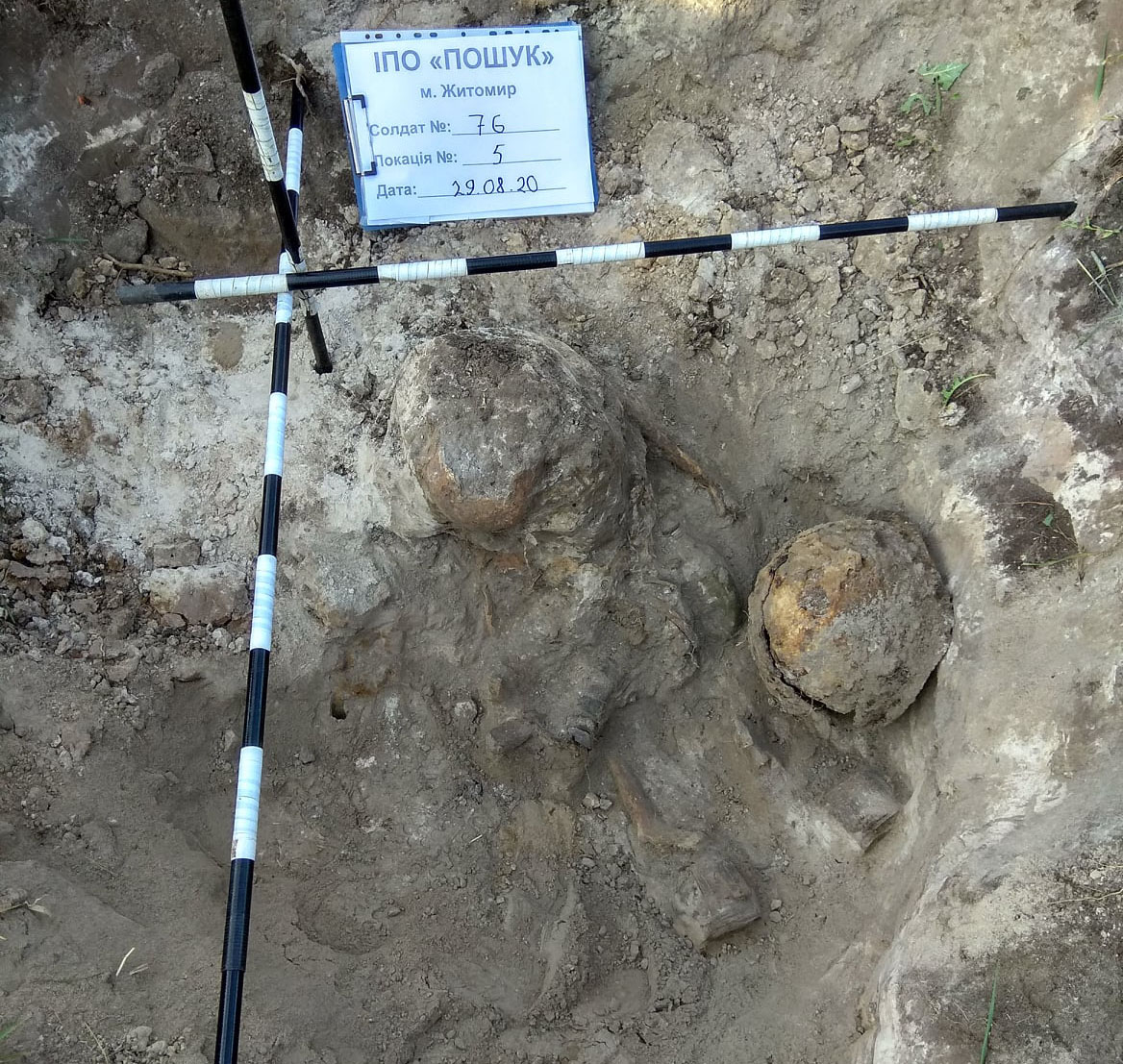 Солдат № 76 знаходився у сидячому положенні. Мав при собі шолом СШ-39, флягу, саперну лопатку, протигаз, підсумки, ложку з надписом «Дорошенко» та гаманець з документами, які вже відправлено на експертизу.