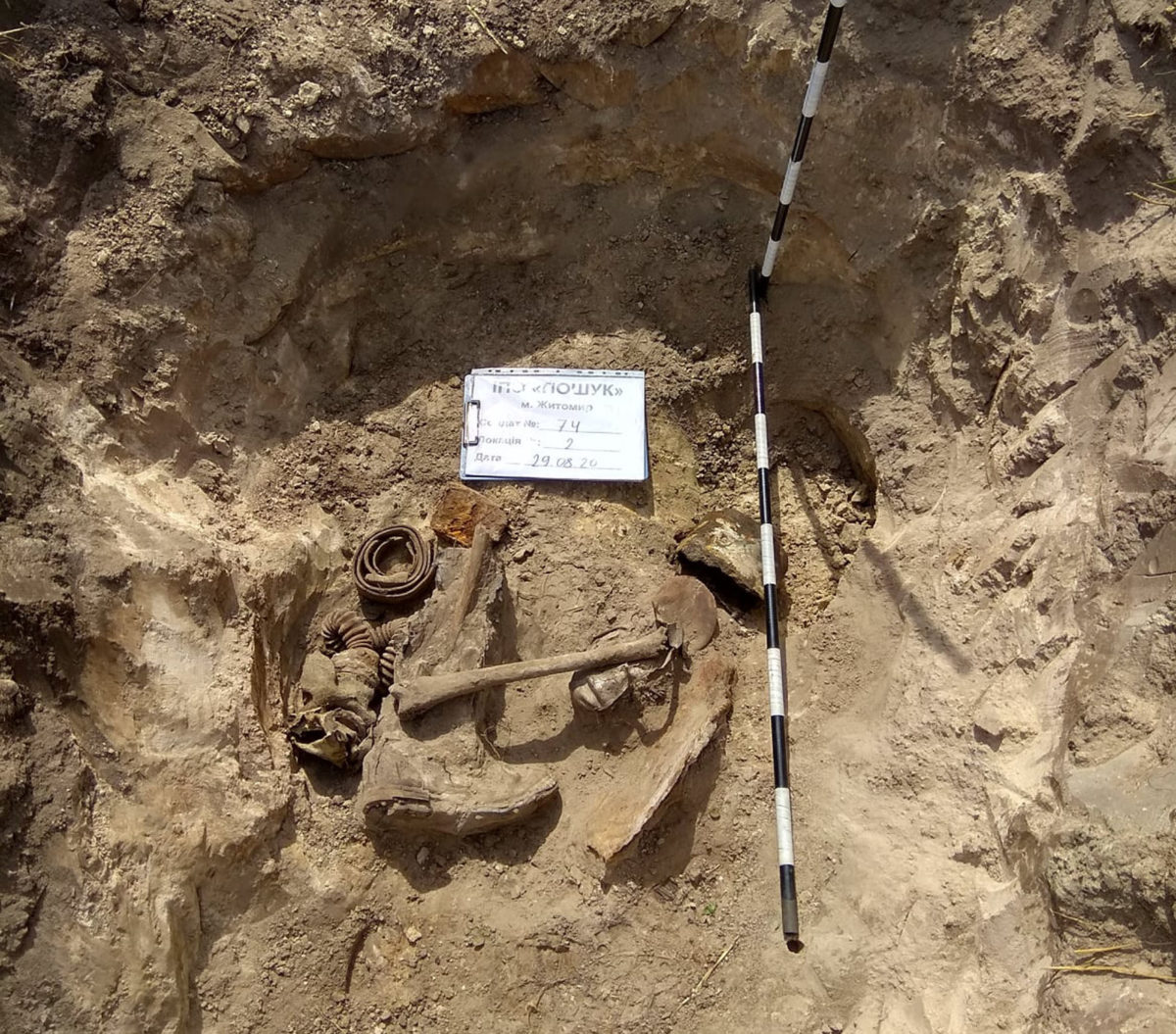Солдат № 75 лежав на глибині 50 см. Мав при собі протигаз та підсумки. Німецькі гільзи в окопі свідчать про те, що поранених червоноармійців добивали…