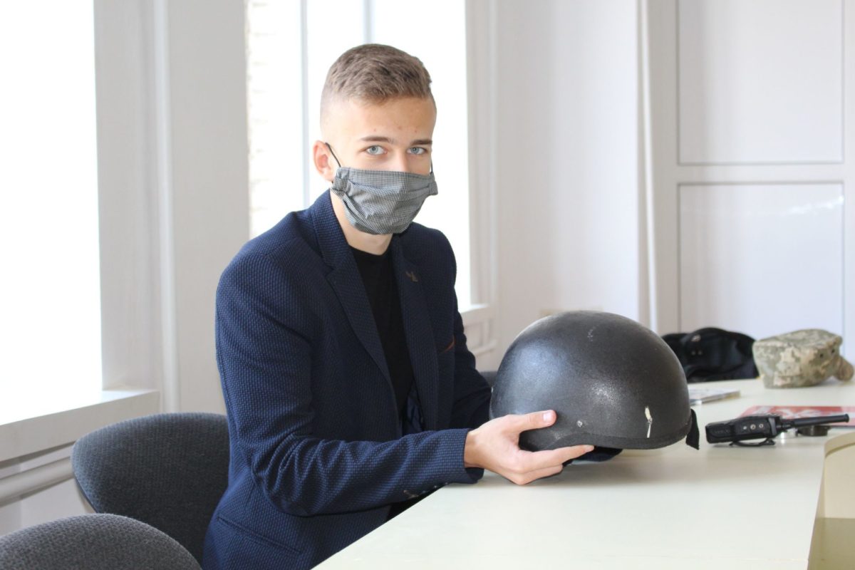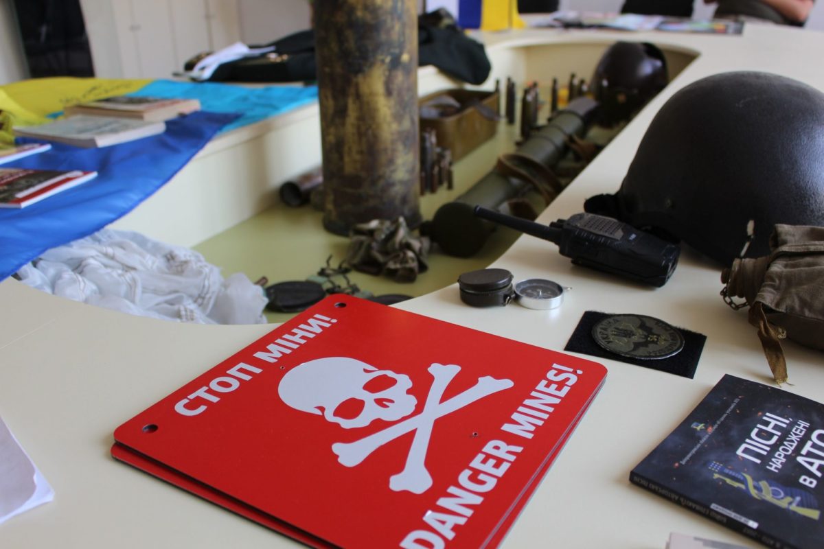 – Прострелений шолом, який я тримаю в руках, врятував життя одному нашому військовослужбовцю… Ось осколки від «сто двадцятої» міни – їх теж батько передав. А це – табличка з написом «Стоп! Міни!», – робить невеличку екскурсію нашому кореспондентові школяр.