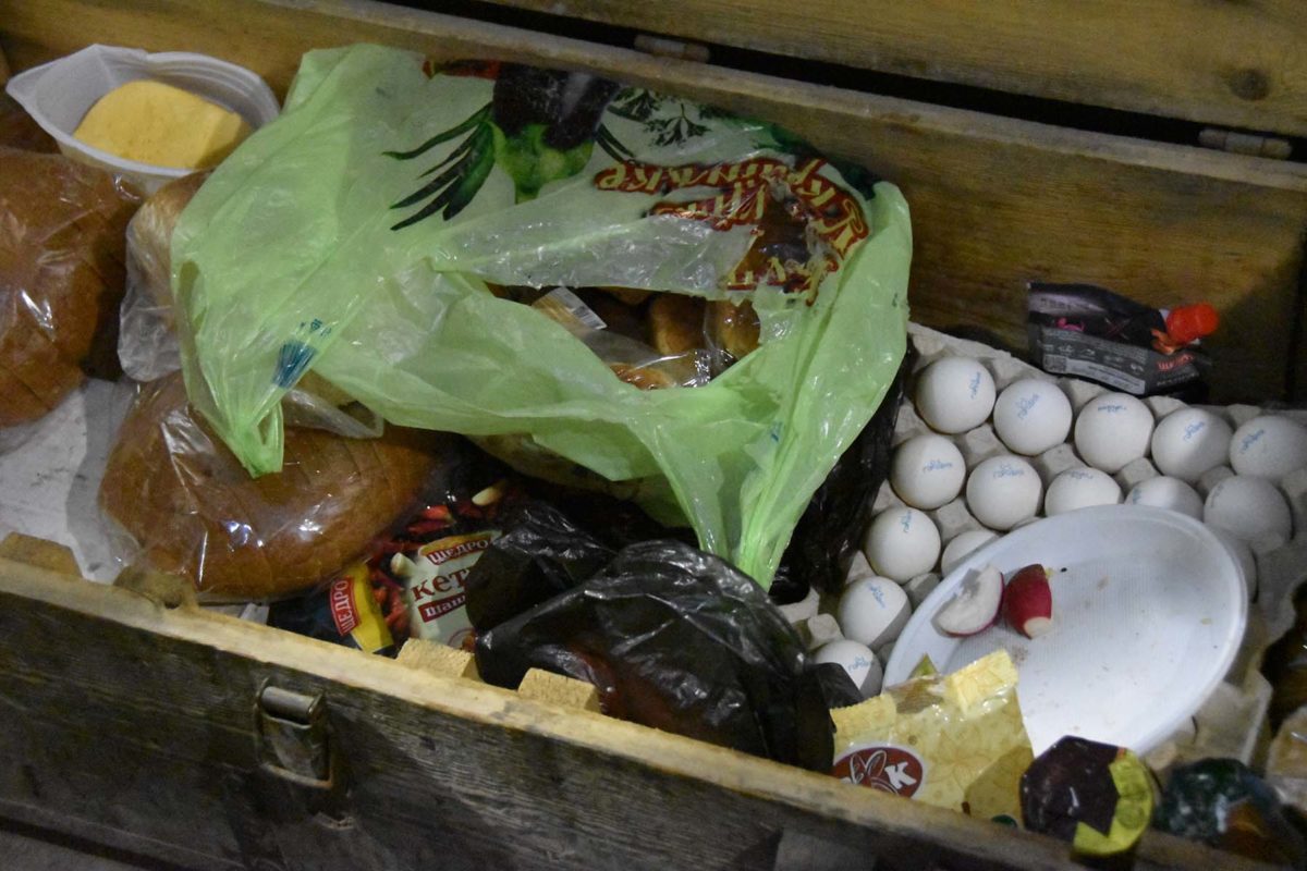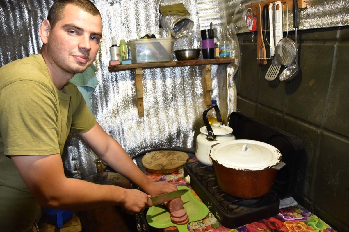 Здавалося б, війна, передок, один з флангів взводного опорного пункту. Про які вподобання чи побажання, де поїсти, може йти мова, головне – безпека. Хлопці для їдальні облаштували потужний схрон – приємний, чисто прибраний (тут так завжди, нас не чекали. – Авт.), на глибині близько 5 метрів. Стіни дбайливо обшиті утеплювачем, на кухні кожен предмет побуту має своє місце. На відстані очей середньостатистичного зросту відвідувача у 1,75 метра на стіні красується вишиваний рушник, дитячі малюнки, обереги і щирі некаліграфічні побажання добра, миру і перемоги.