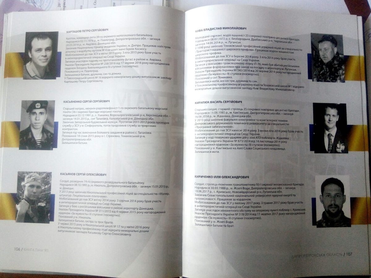 Як розповів один із авторів-упорядників видання, завідувач відділу Громадянський подвиг Дніпропетровщини в подіях АТО/ООС Музею АТО ДНІМ імені Д. І. Яворницького Вадим Якушенко, ця книга – розповідь про загиблих на Донбасі військовослужбовців Збройних Сил України – уродженців Дніпропетровщини. Видання міститиме поіменний список, фото кожного героя, короткі біографічні дані, відомості про військові звання, посади, бойовий шлях, обставини загибелі, місця поховання, нагороди, а також буде доповнена інформація щодо встановлених меморіальних дошок і стел.