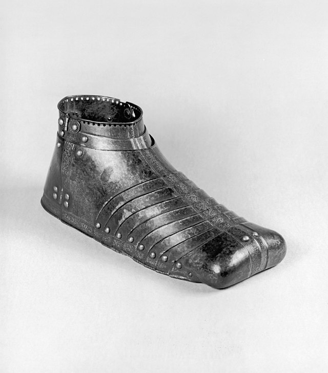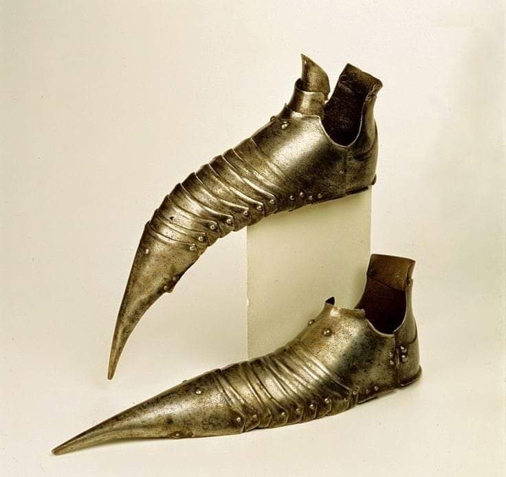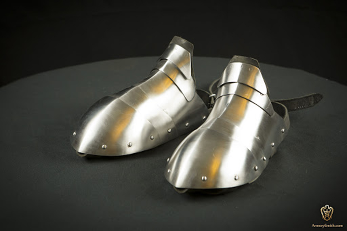 Мода Середньовіччя внесла кардинальні зміни в костюм воїна. Шкіряне взуття замінили металевими латами. Взуття лицаря мало довгий гострий носок, який міг бути знімним із загнутою донизу формою. Таке взуття призначалося тільки для використання верхи на коні й давало змогу завдавати смертельних ударів ногами.