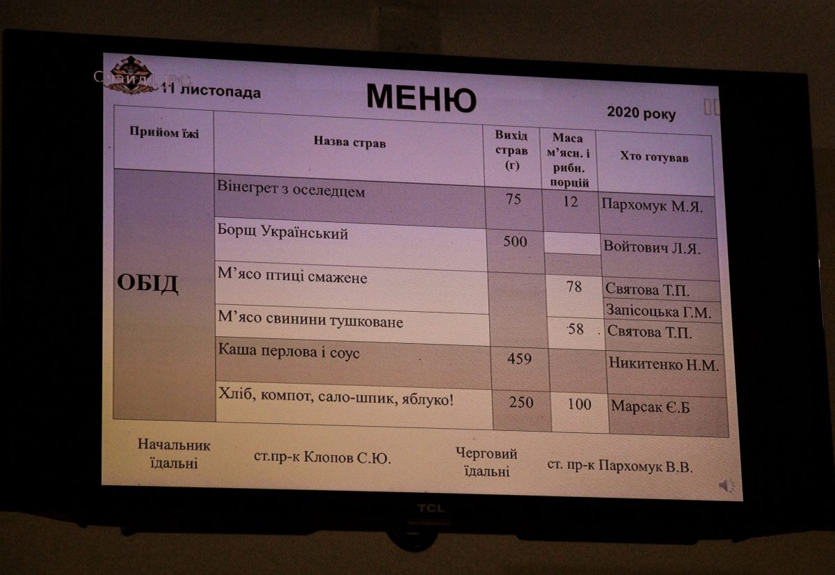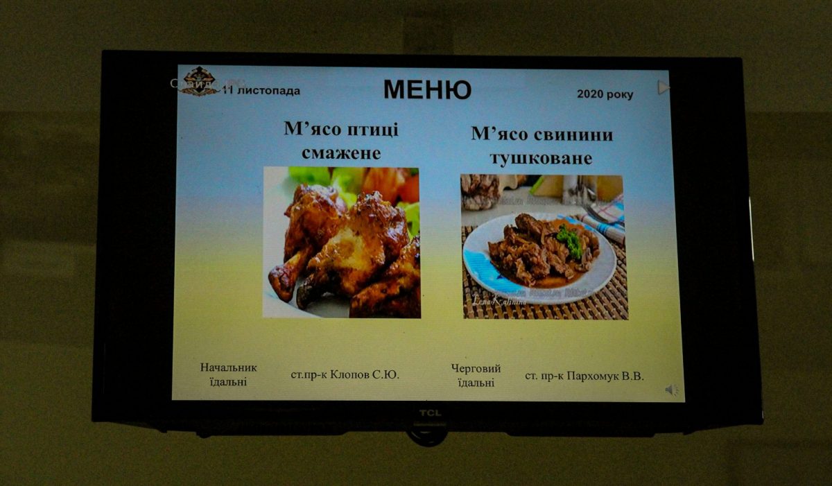 Майже вісім місяців і загалом близько трьох мільйонів гривень знадобилось військовим залізничникам, щоб зробити невеличке диво – повністю відремонтувати та переобладнати свою їдальню. Тепер тут нічого не нагадує про зубожіле солдатське гастрономічне минуле, яке, як сподіваються вояки, пішло в далеку і глибоку історію. І річ не лише в тім, що зала приймання їжі має вигляд люксової ресторації, а на вході кожного військового зустрічає електронне меню, де видно не тільки, яку страву нині запропонують на сніданок-обід-вечерю, а й навіть прізвище кухаря, який готував цю їжу. Це, так би мовити, додаткова запорука гарантії якості страв і своєрідний автограф від «шефа».