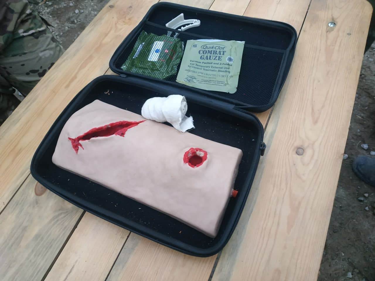 Далі за програмою курсанти вчилися зупиняти кровотечі за допомогою тампонування й тугих пов’язок у випадках, коли накласти турнікет неможливо. Тут в хід йшли медичні тренажери. Виконані вони з силікону, вигляд ран і ушкоджень дуже натуральний. Крім того, за допомогою спецобладнання та підфарбованої води можна інсценувати і кровотечу.