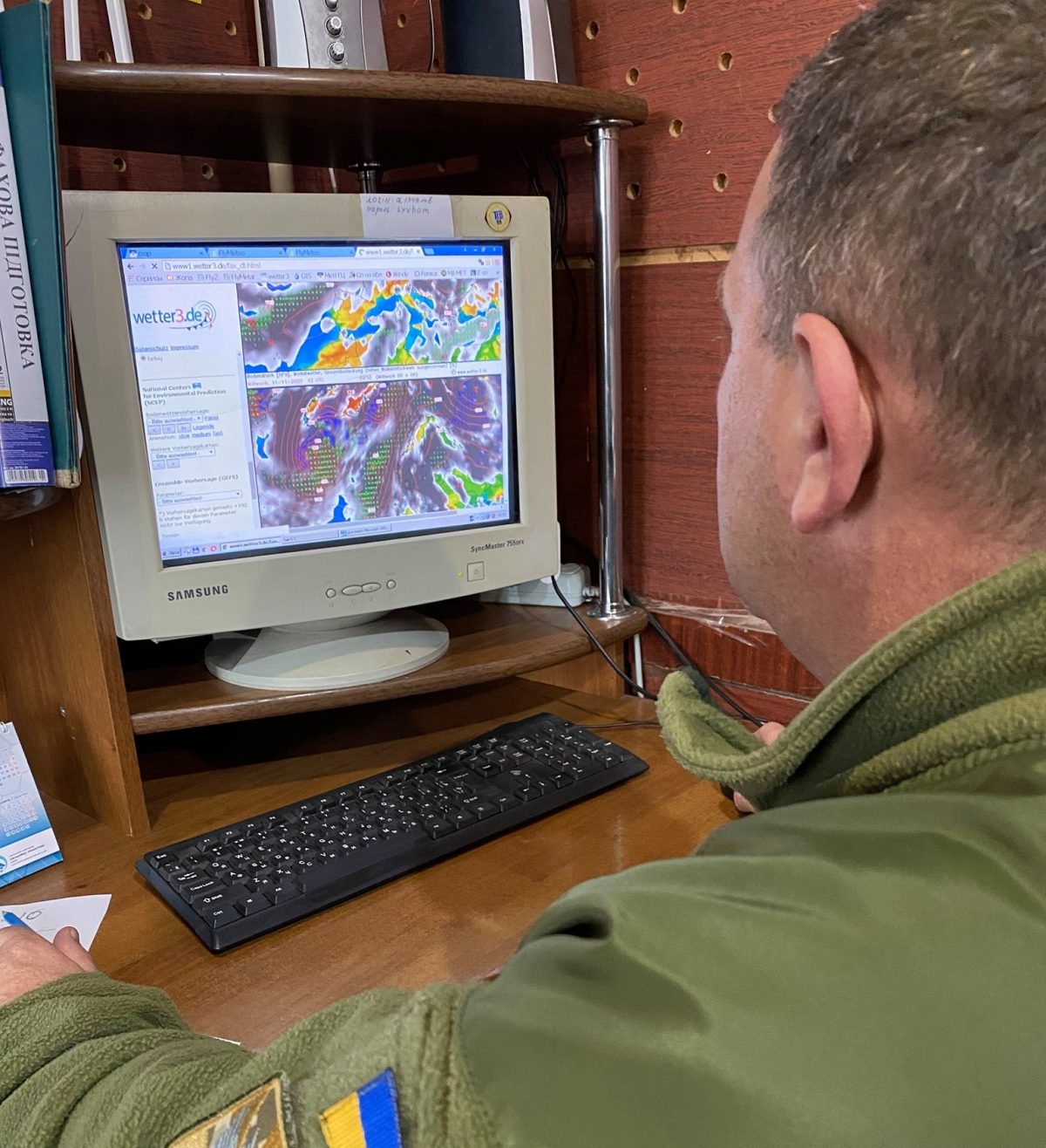 – Гідрометеорологічна служба веде спостереження за синоптичними процесами, які впливають на клімат та обробляє дані з метеорологічних станцій, ця процедура має назву радіозондування, – зазначає капітан Сергій Кушнір. – За допомогою неї проводяться ряд розрахунків для забезпечення безпечних польотів. Напередодні польотів метеоспеціалісти проводять детальні розрахунки та прогнозування, що забезпечує точність прогнозу та успішність виконання завдання. Оцінка та визначення погодних умов для подальших прогнозів проводиться за допомогою синоптичних карт та спеціальної техніки.