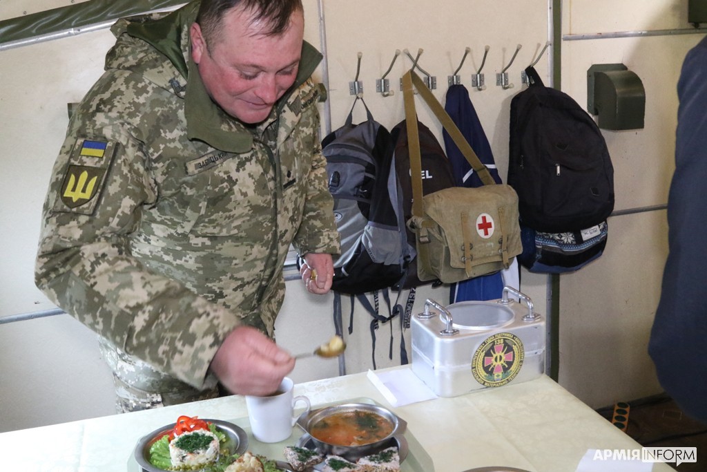 А відповідно до меню-розкладки продуктів завдання всім трьом командам випало нелегке. Гостра зупа-бограч була першою стравою, а другою – м’ясні лангети (це щось схоже на відбивні) з гарніром із гречаної каші. Щодо салату – олів’є. Та, щоби запити все це, слід було зварити узвар із сушених фруктів. На виконання завдання давалося дві години. А готували всі страви з використанням польових кухонь КП-50. Оцінювати вправність конкурсантів повинно було журі, до складу якого увійшли офіцери навчального підрозділу логістики, а також представники ресторанного бізнесу. Крім того, остаточну крапку в питанні, хто саме переміг, повинні були поставити солдати-строковики, для яких і готували обід за меню-розкладкою.