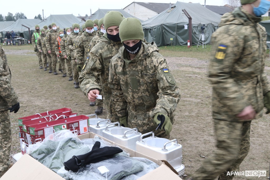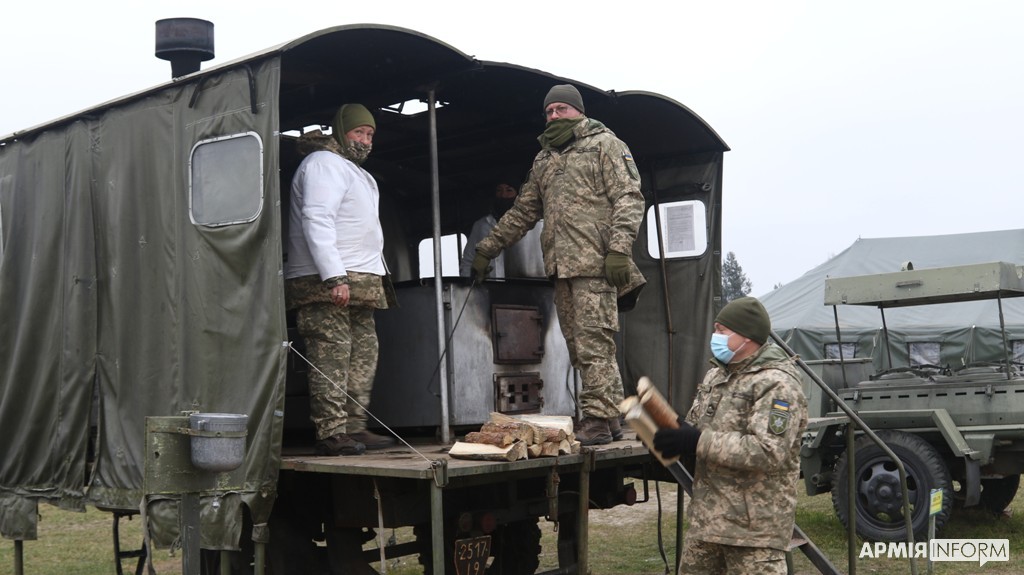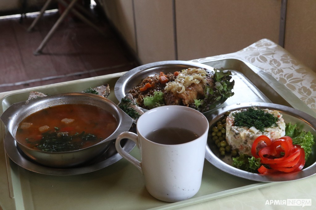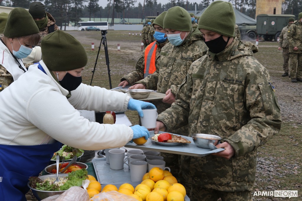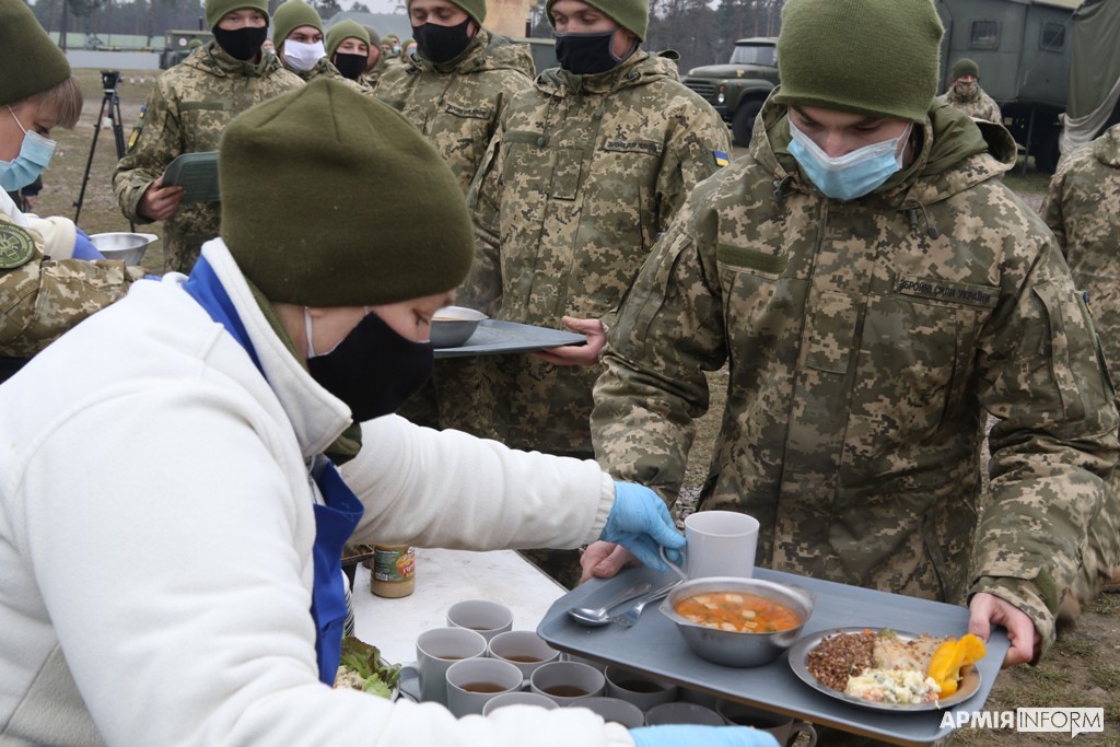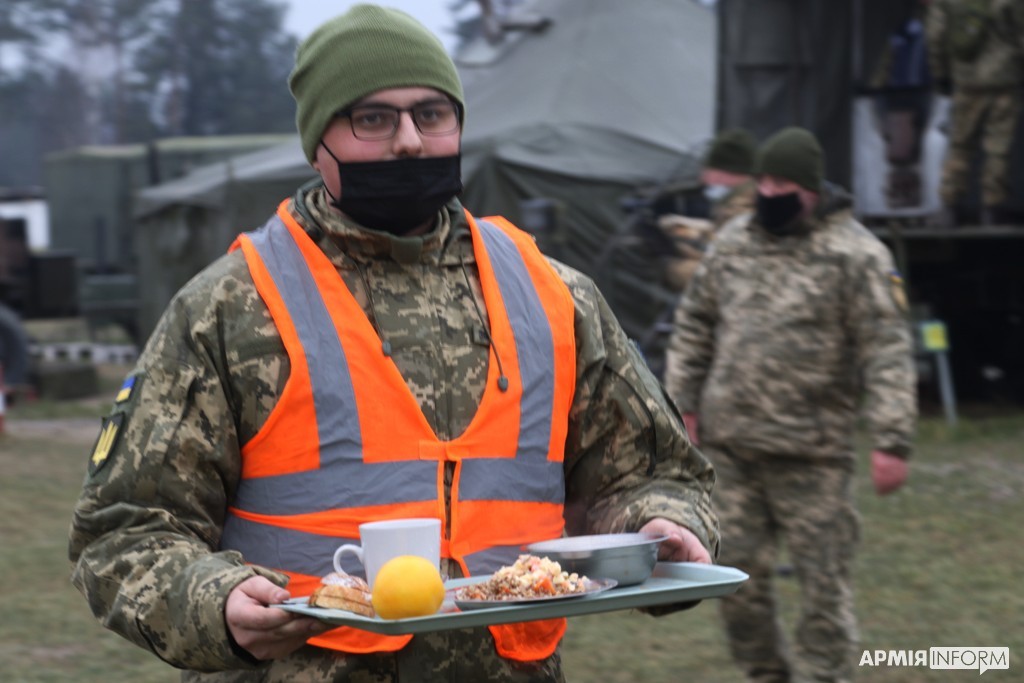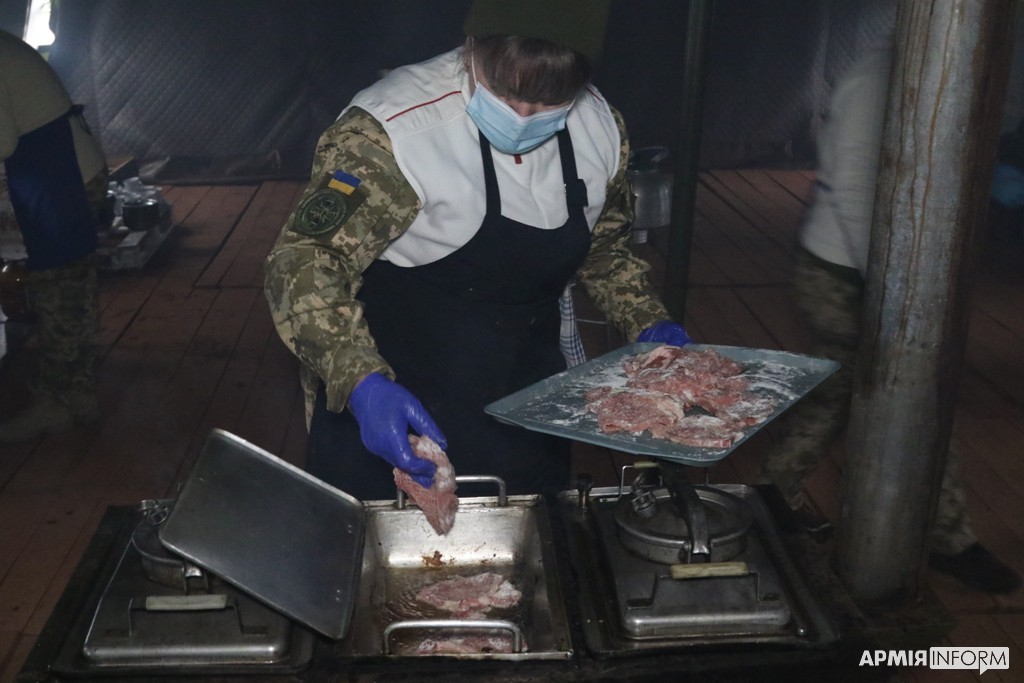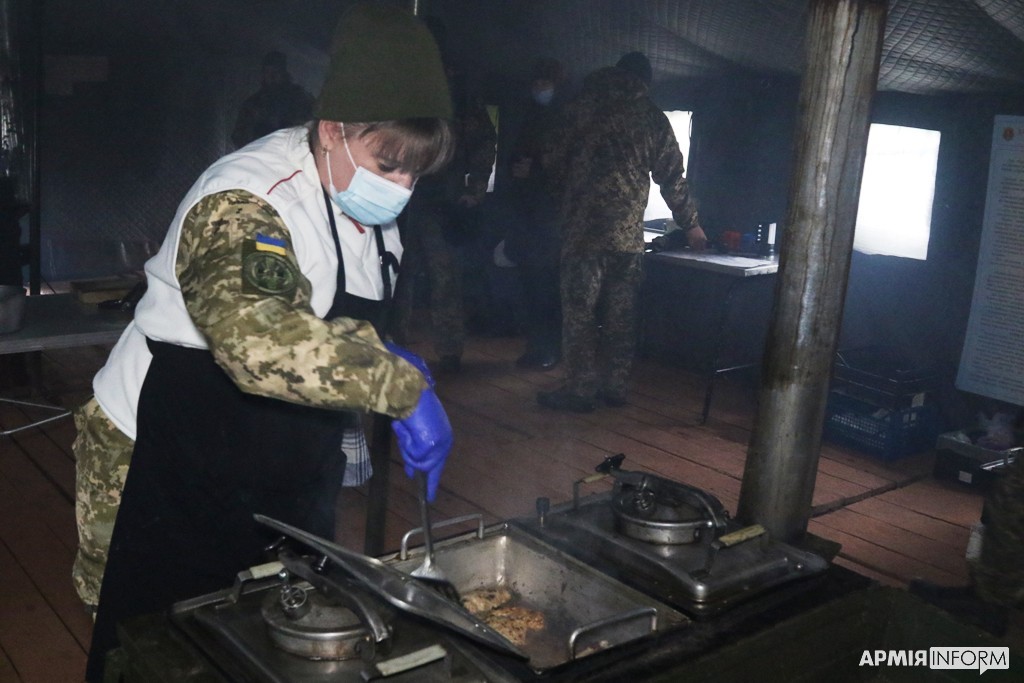 Старша зміни старший солдат Наталія Коваль розповіла, що у війську кухарем служить вже близько чотирьох років. Профільну освіту здобувала в коледжі харчової промисловості. Але спеціальну армійську підготовку для роботи у військових їдальнях проходила тут, на Львівщині. Повний курс навчання зайняв чотири місяці. З того часу працює у їдальні однієї з військових частин полігону.