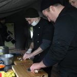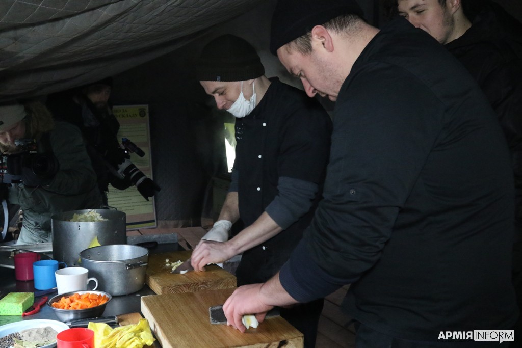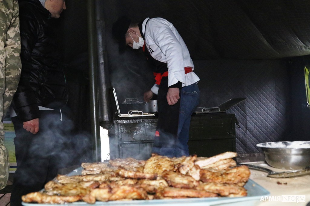 У наметах з цивільними кухарями ситуація дещо інша: хлопці працюють, як кажуть, «на куражі». Але видно, що умови дещо не комфортні для тих, хто звик до світлих і просторих кухонь великих ресторанних мереж. Так, у польових умовах бракує світла в наметах, польові «капешки» димлять. А інгредієнти слід готувати самотужки. Бо в цивільному ресторані це не робота для «шефа» – усі інгредієнти завчасно нарізані, змішані і розкладені помічниками в необхідних пропорціях. А тут – крутись сам, як можеш. Але хлопці не скаржаться і намагаються вкладатися в час.