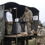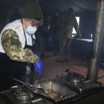 Це вона розповідає під час виконання кухонних робіт. У наметі, де готують їжу військовослужбовиці, відбувається такий собі гастрономічний балет: уся трійця переміщається між столами з продуктами і пічками КП-50 начебто і неквапливо, але кожен рух вивірений і незайвий: там нарізати, там долити води, там посолити, тут спецій додати.