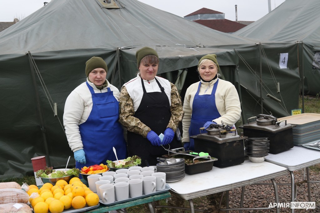 І ось, за командою судді, відлік часу розпочався, і команди розійшлися по наметах із кухнями. За дивним збігом обставин, окрім битви кухарських навичок, це було ще й, так би мовити, гендерне змагання. Цивільні ресторани виставили команди, укомплектовані чоловіками. А от кулінарну честь війська біля плити захищали три військовослужбовиці. Старші солдати Наталія Коваль, Мирослава Баглай та Любов Чорнописька.
