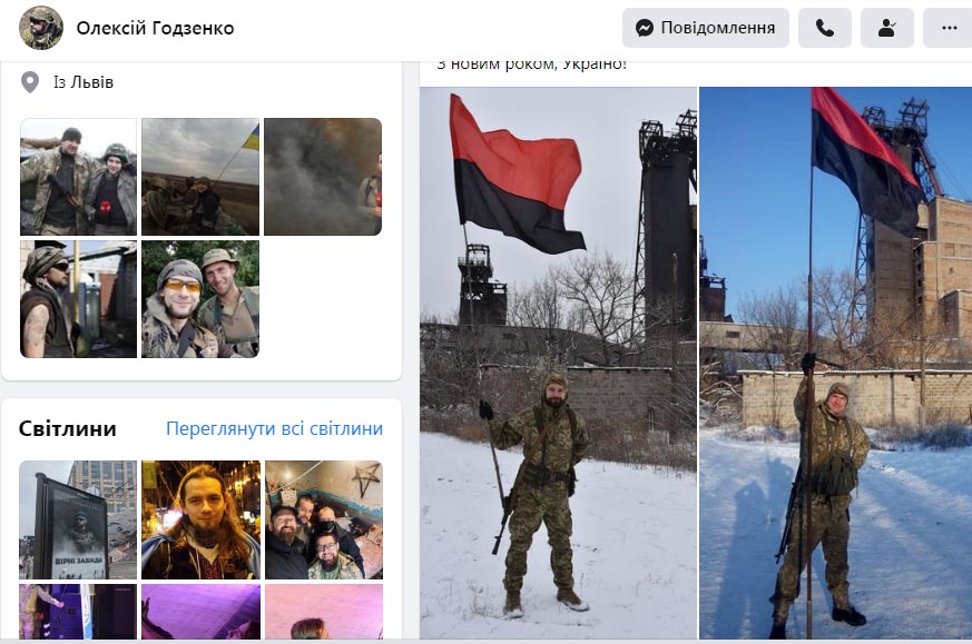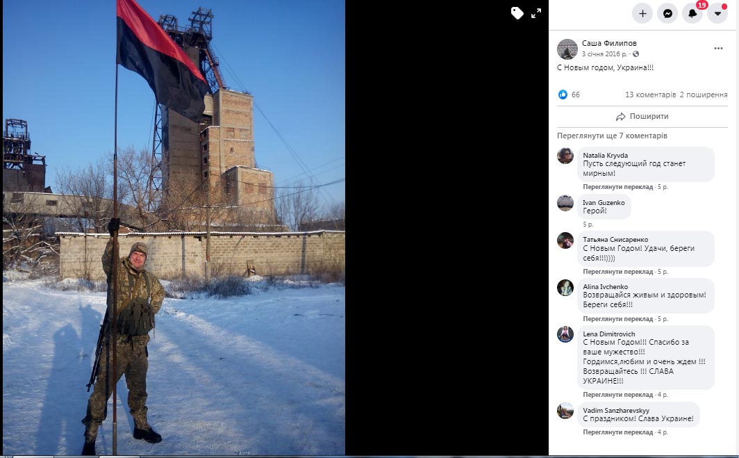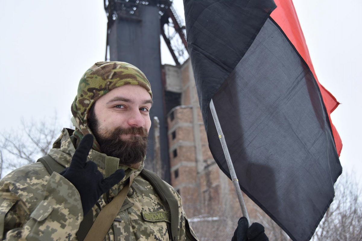 — Новий 2016-й рік вони зустрічали тут, в районі Шумів, Зайцевого, Торецька, Південного, — розповідає Олексій «Годзила», цей псевдо він взяв від свого батька. — 1 січня всі разом достойно відзначали день народження Степана Андрійовича Бандери. Того ж дня «звільнили» Торецьк від пам’ятника Леніну. А 3-го січня батьків побратим Олександр Філіпов виставив пост «З Новим роком, Україно!» з батьковою світлиною, зробленою на фоні шахти «Південна». Батько на світлині з червоно-чорним прапором. Саме це знамено я наразі тримаю в руках. Мені його побратими передали як один з яскравих спогадів про батька. Відтоді цей прапор завжди зі мною, — каже Олексій.
