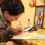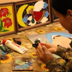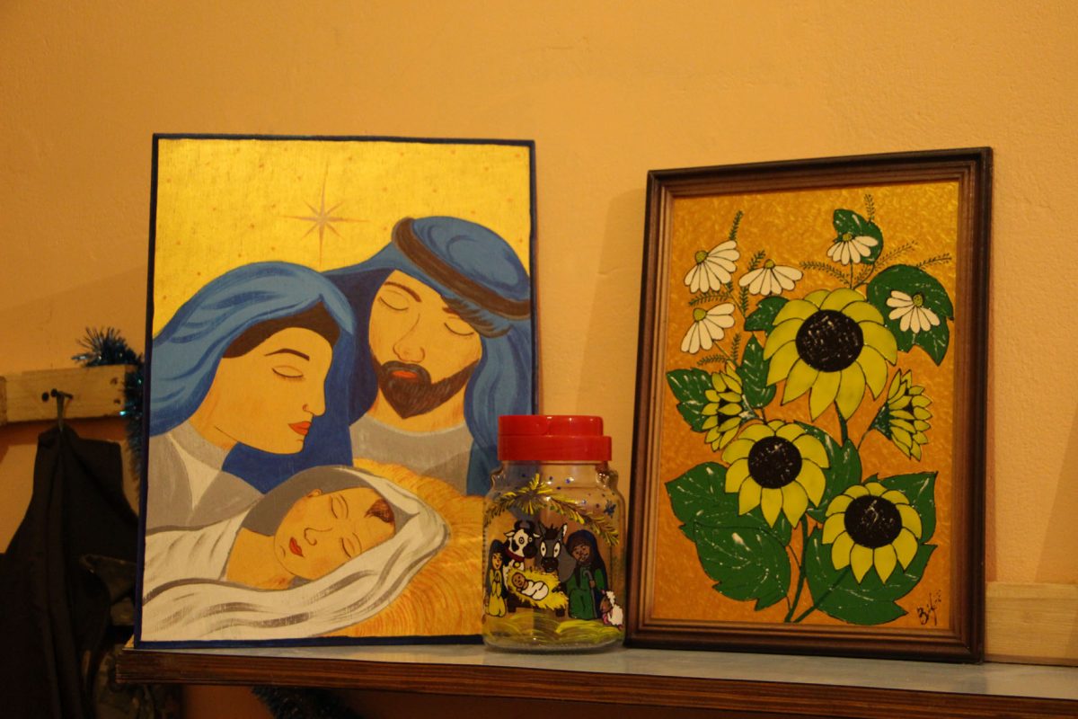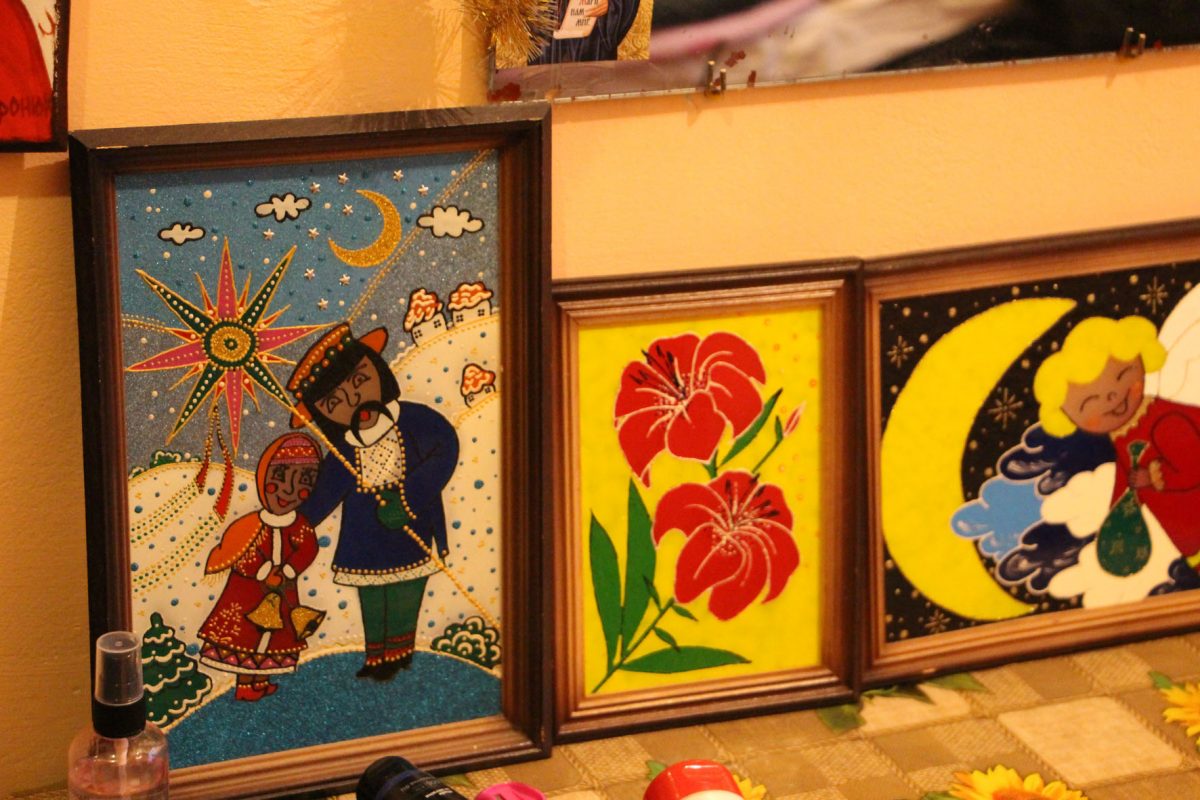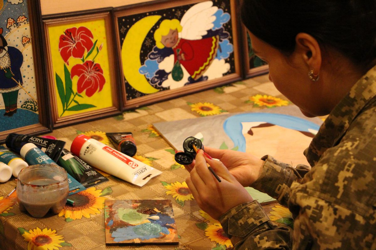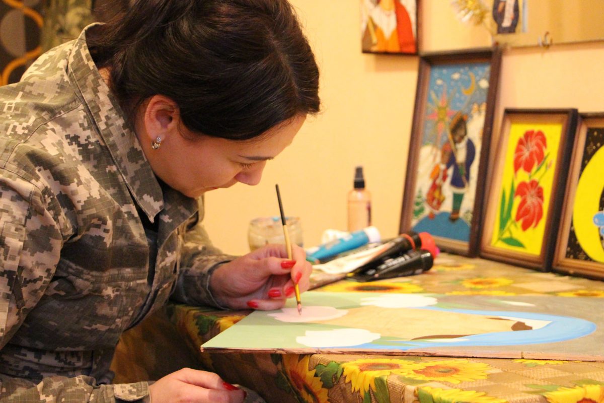 – Я вмію і в’язати, і вишивати, і гачкувати, і на машинці шити, але все життя мріяла навчитися малювати, – ділиться Ольга. – Тож почала малювати на склі, а вироби – продавати на ярмарку. Спочатку – на горнятках та баночках, згодом – уже більш складні роботи, картини на склі. Малюю, потім – гартую у духовці, аби міцнішими були. Ну, тут, на Сході держави, звичайно, малюю не на склі – і запікати немає де, та й поб’ється скло. Тож нині я малюю по дереву. Маю мрію малювати, як деякі військові художники, ікони на дошках від снарядних ящиків – та де ж я, телефоністка, їх візьму…